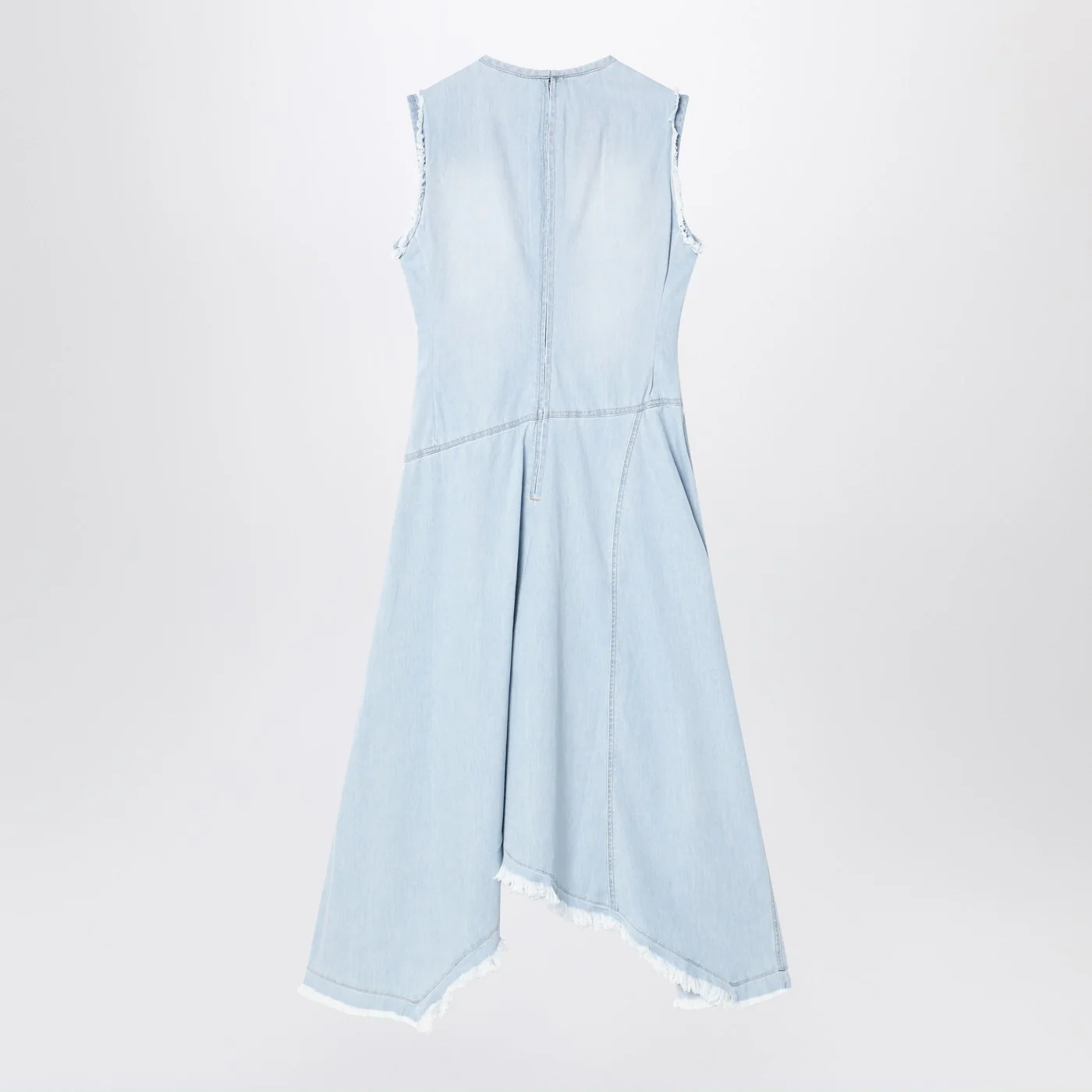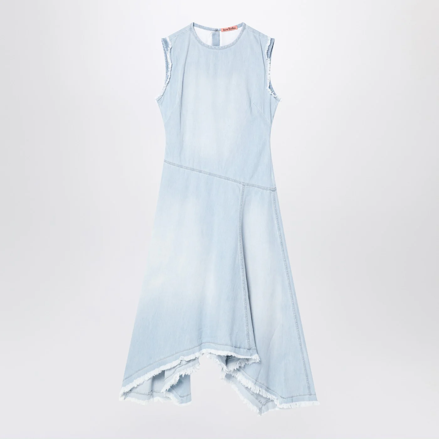 Acne Studios light blue cotton denim sleeveless crew neck dress with asymmetric hemline.