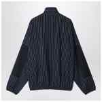 Acne Studios jacket in navy blue wool blend with pinstripe pattern, featuring a two-way zip front closure with ribbon detail, side pockets, elasticated hem and cuffs, lined interior, lettering logo embroidery on the chest, relaxed fit and hip length.