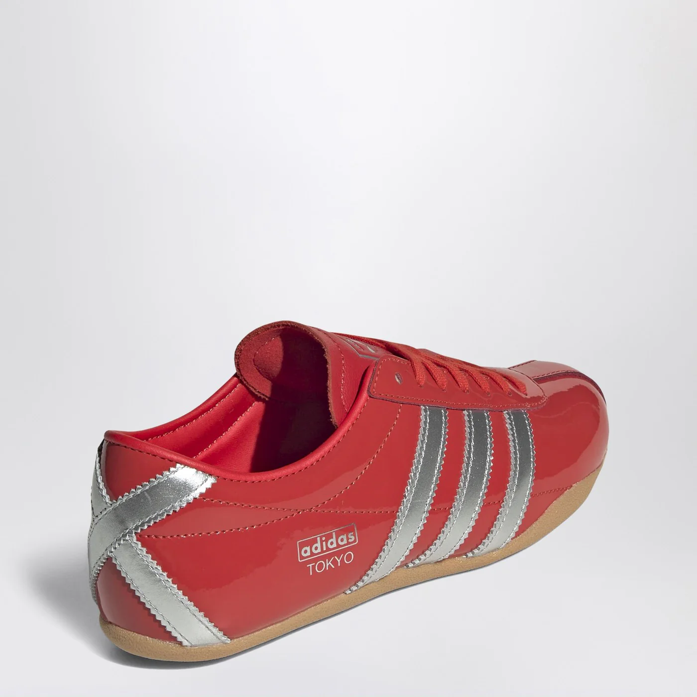 Sneaker by adidas Originals in red patent leather featuring silver side stripes lace-up closure logo on the tongue and side and rubber sole.