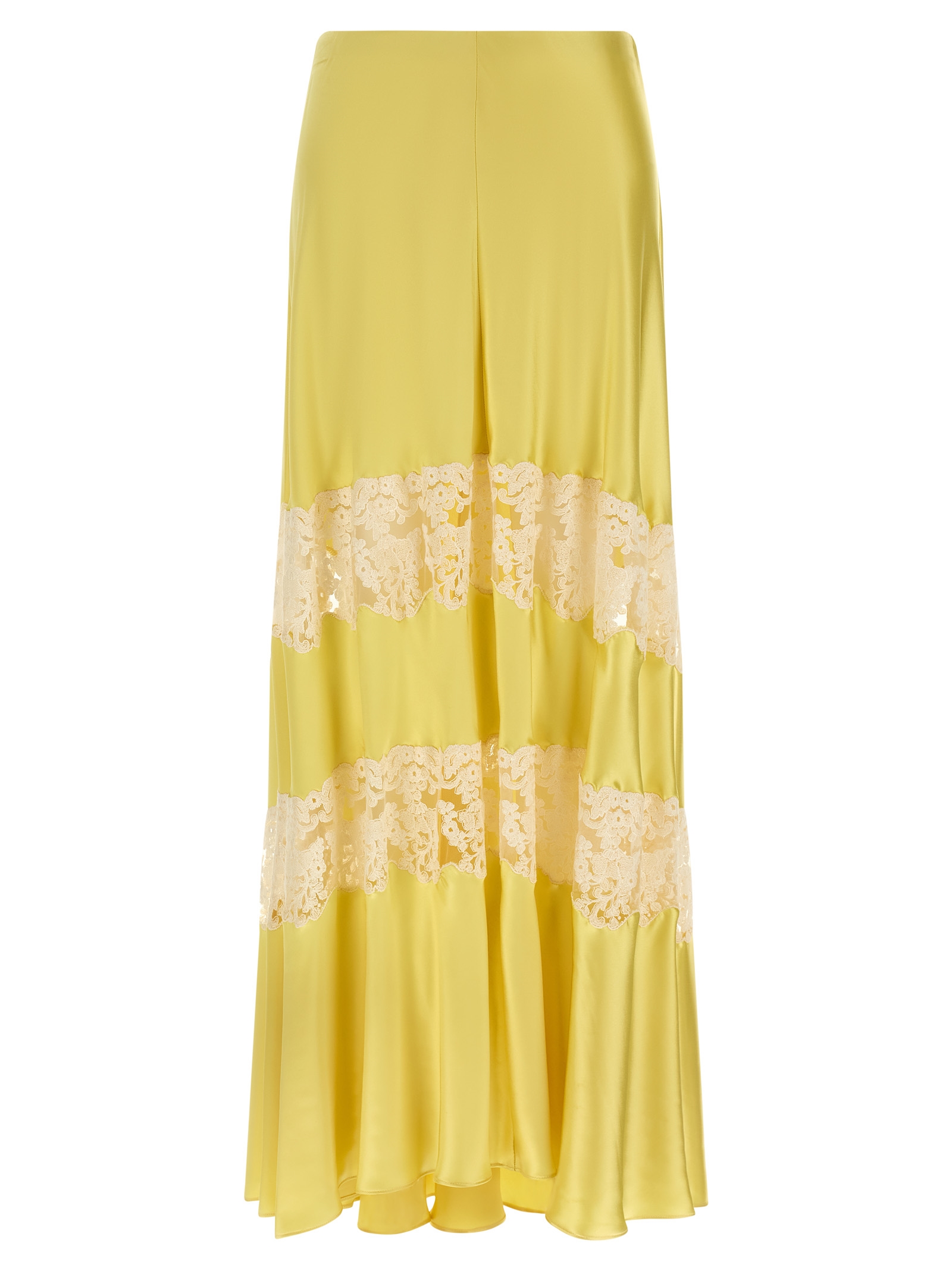 Long skirt in shiny viscose with contrasting lace inserts, flared silhouette, elastic waistband, and asymmetrical hem.
