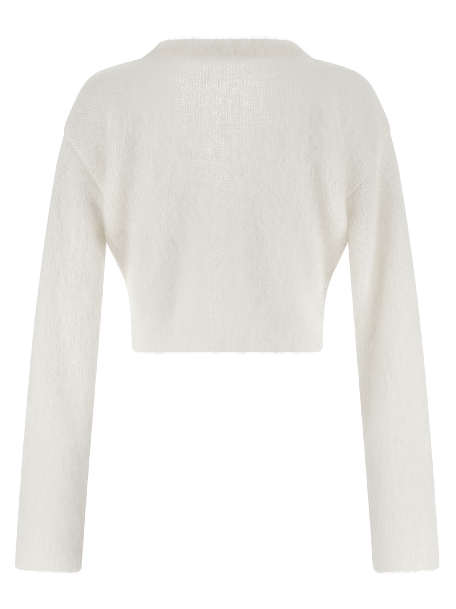 Carded Mohair’ cardigan in alpaca and wool blend with embroidery and cut-out details, crop model, V-neck, front button closure, long sleeves.
