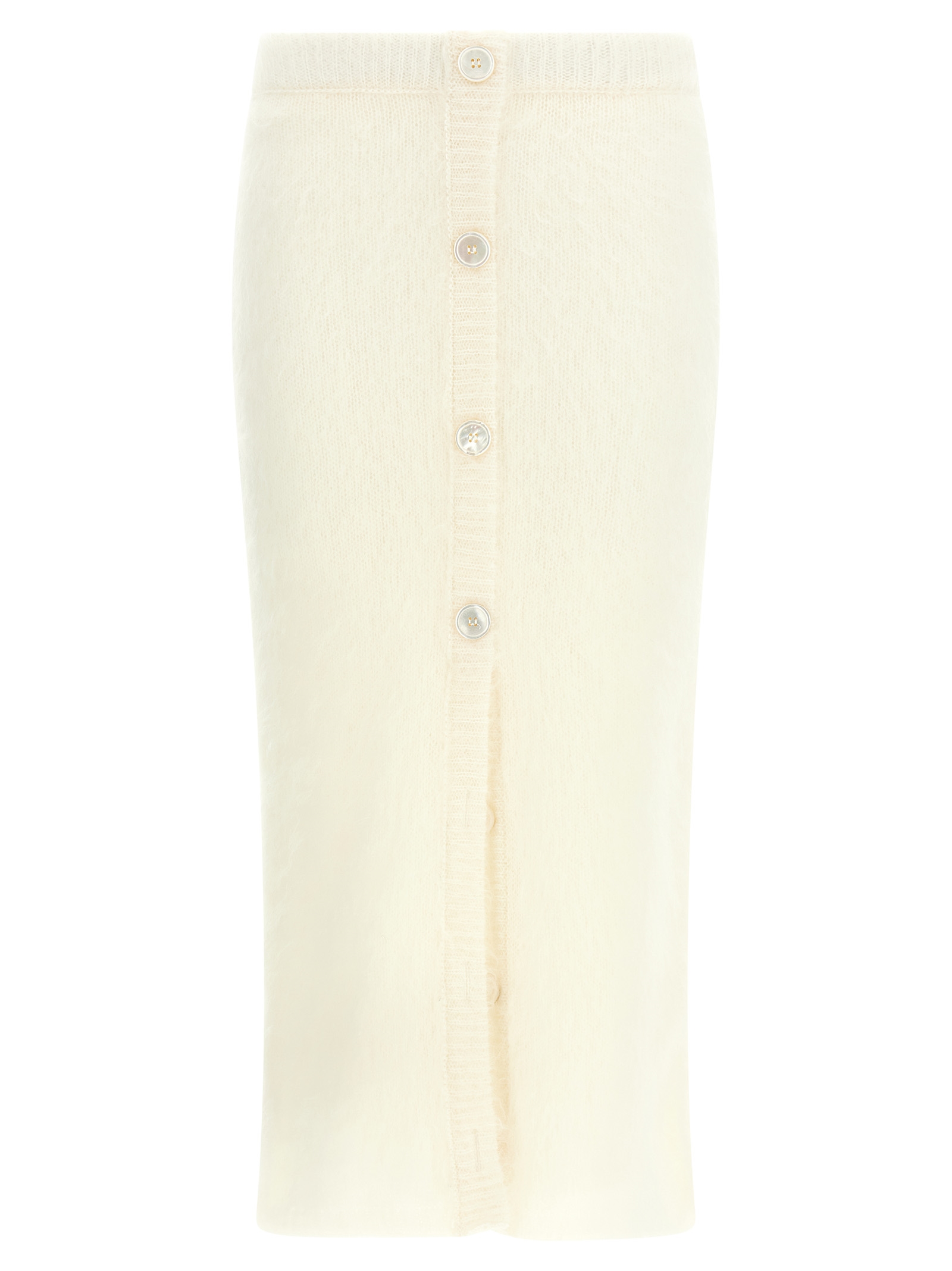 ‘Carded mohair’ wool knit midi skirt, sheath dress style with elastic waistband and front opening with buttons.