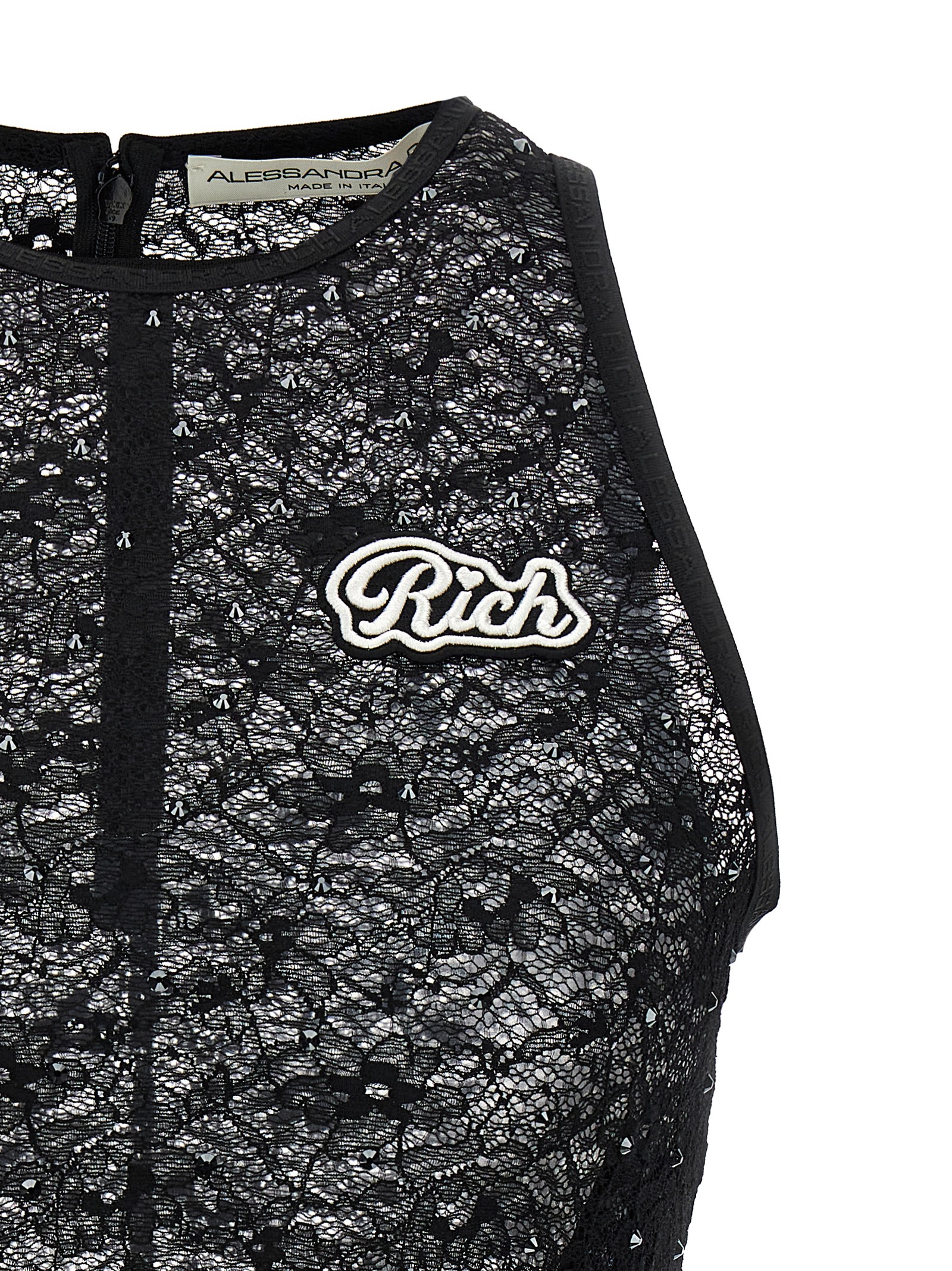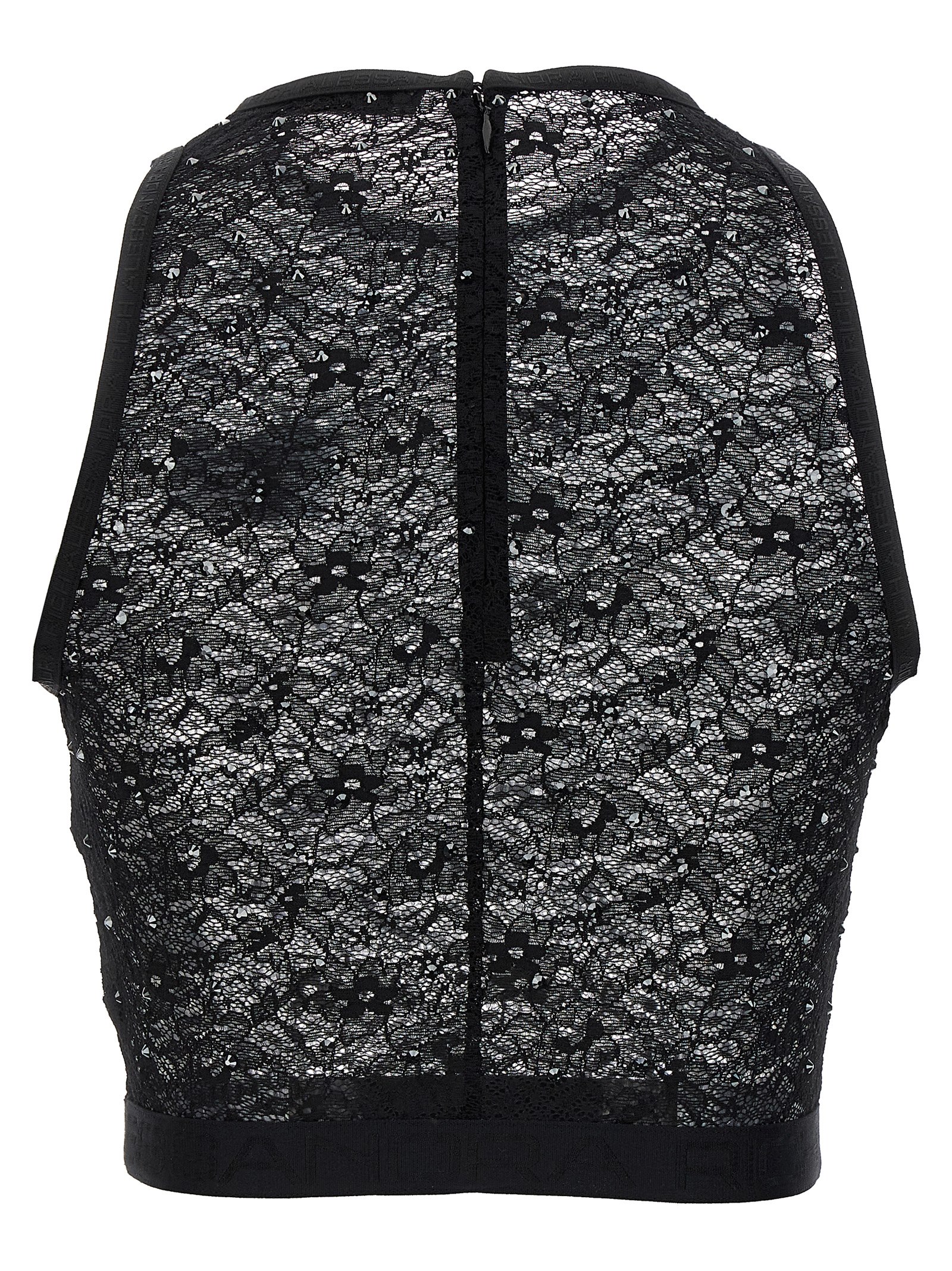 Lace top with rhinestone appliqué, crew neck, sleeveless cropped style, front logo embroidery, back zip closure.