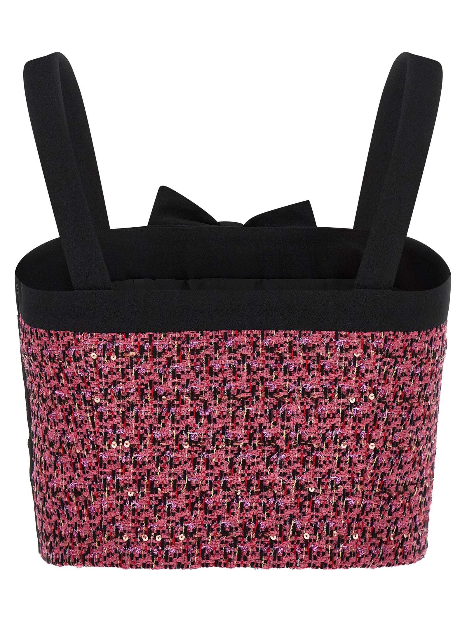 Wool blend tweed top with all-over micro-sequin embroidery, front metal buttons and bow detail, and shoulder straps.