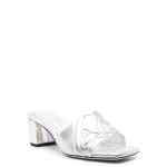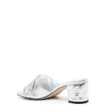 silver-tone calf leather metallic finish Seal-logo embossed effect square open toe branded footbed low block heel leather outsole slip-on style Metallic leather heel sandals