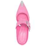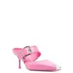 75mm metallic toe-cap detail mules from Alexander McQueen featuring slip-on style, side buckle fastening, metal toecap, bubblegum pink, calf leather, pointed toe, branded insole and 75mm high heel. Punk buckled leather mules
