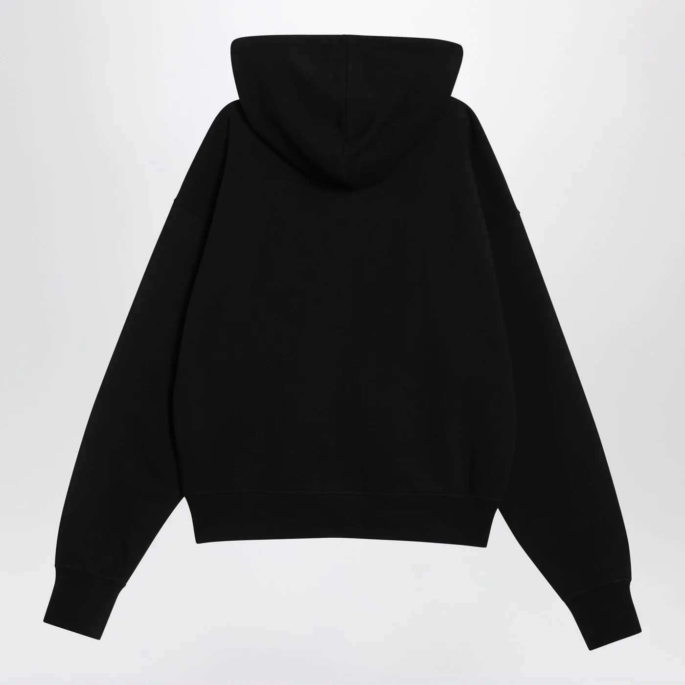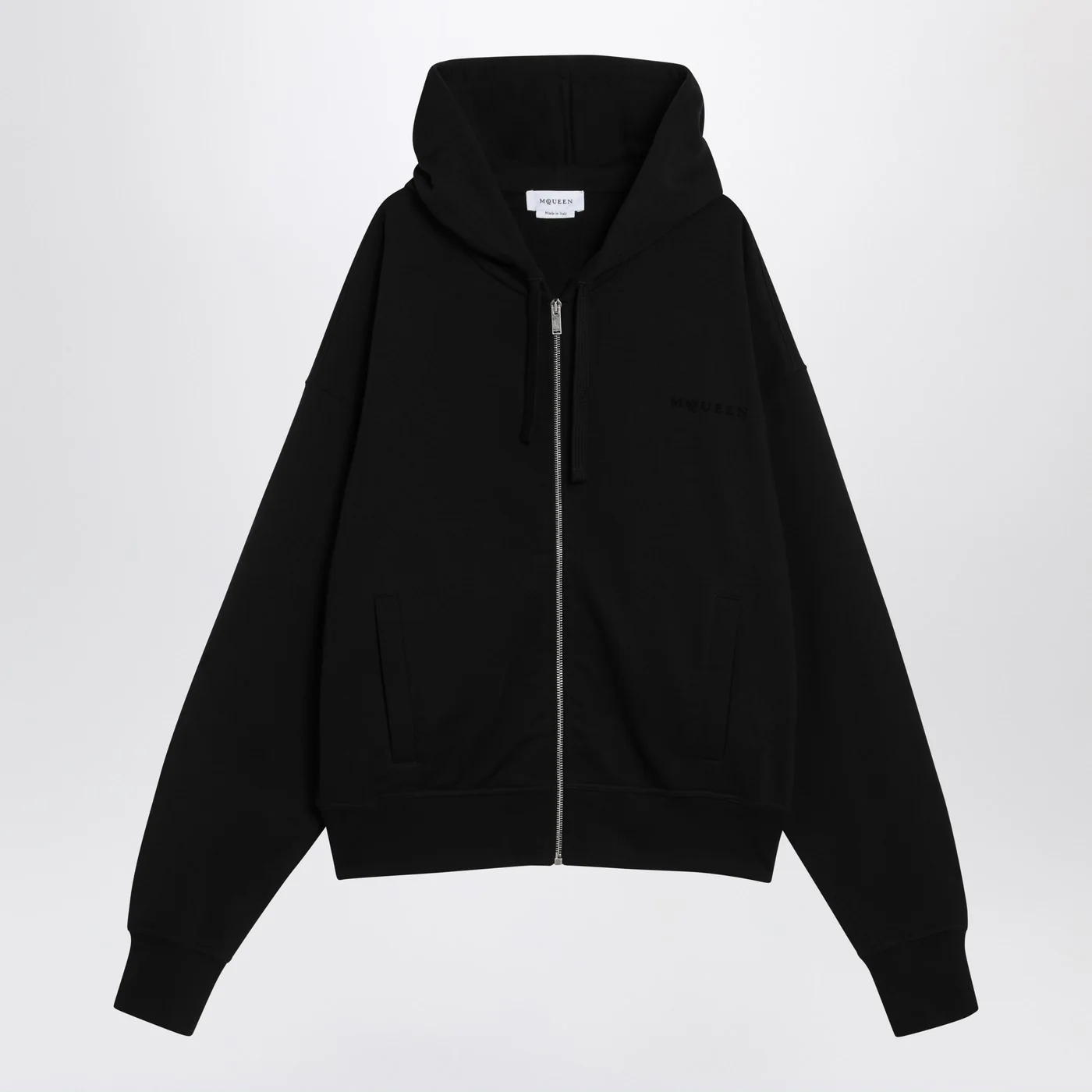 Black cotton Balenciaga sweatshirt characterized by a visible zip front closure hood with drawstring two front pockets wide long sleeves tone-on-tone logo lettering on the chest ribbed edges and a loose fit.