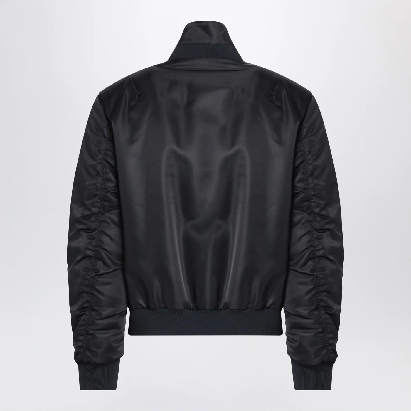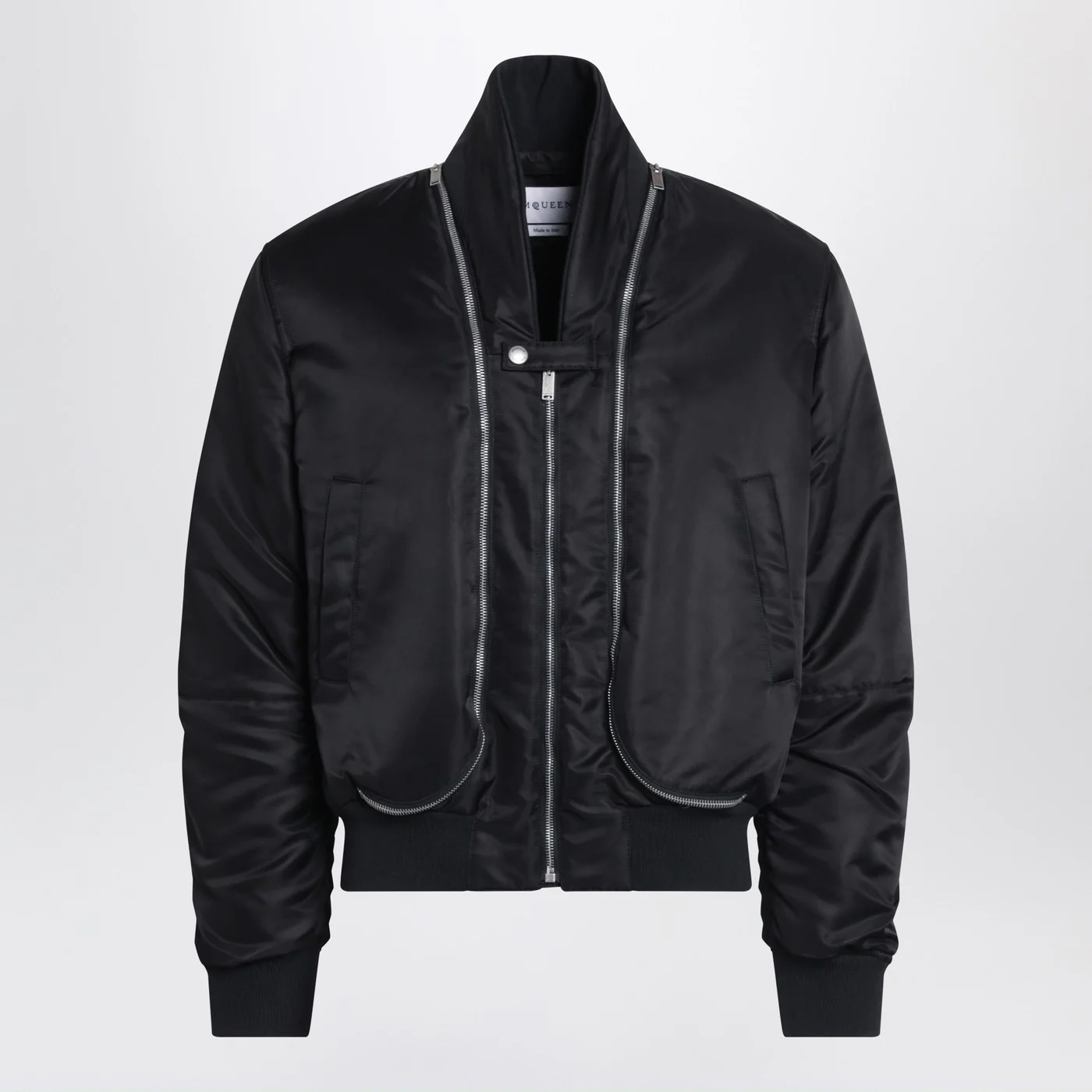 Bomber by Alexander McQueen in black nylon featuring a front zip closure with a snap button tab long sleeves two side welt pockets ribbed edges front details with visible metal zip and checkered lining.