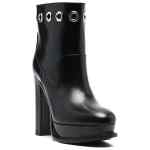 130mm platform-sole eyelet boots from Alexander McQueen featuring black, calf leather, almond toe, eyelet detailing, ankle-length, platform sole and high block heel. Leather heel ankle boots