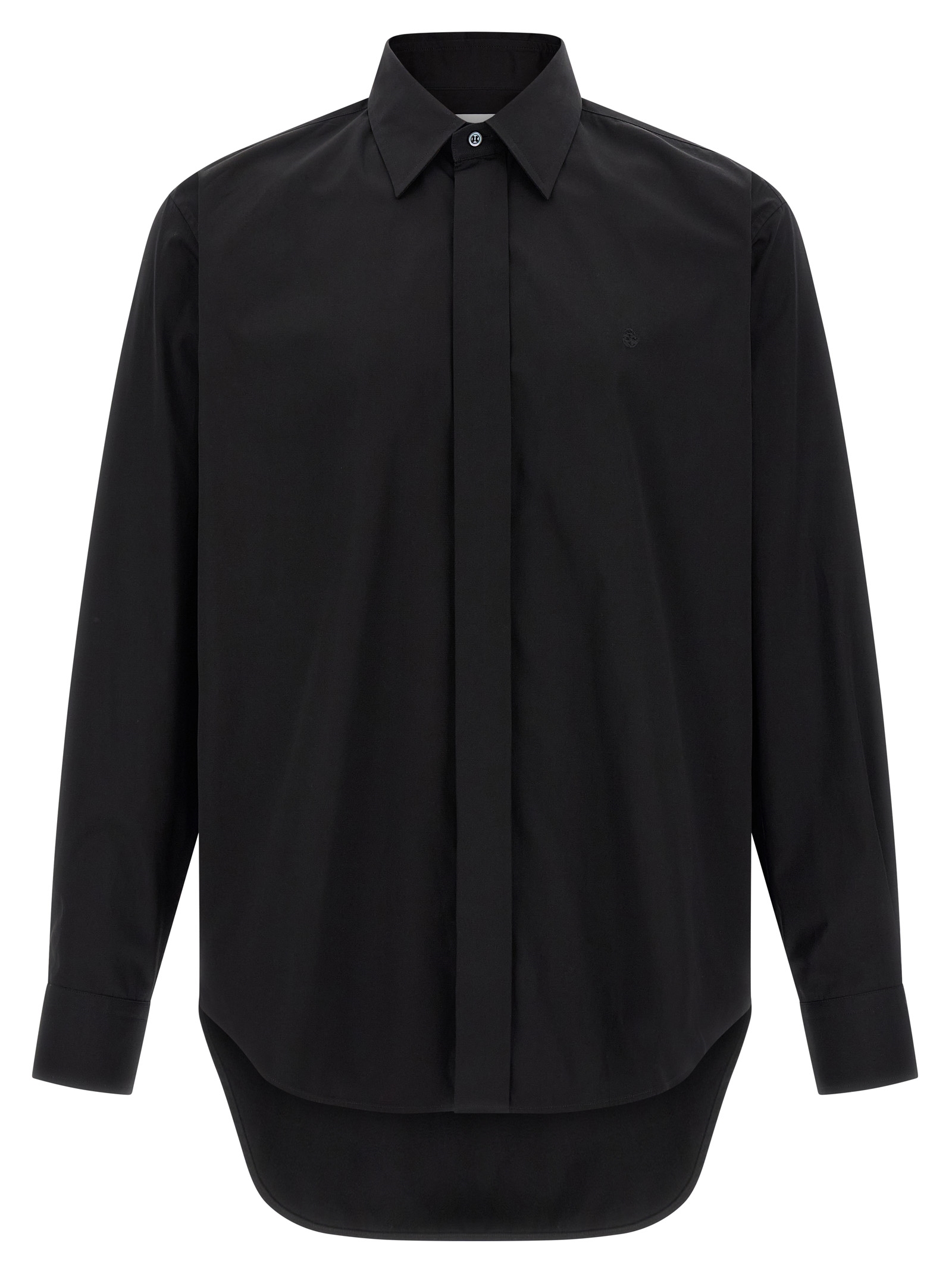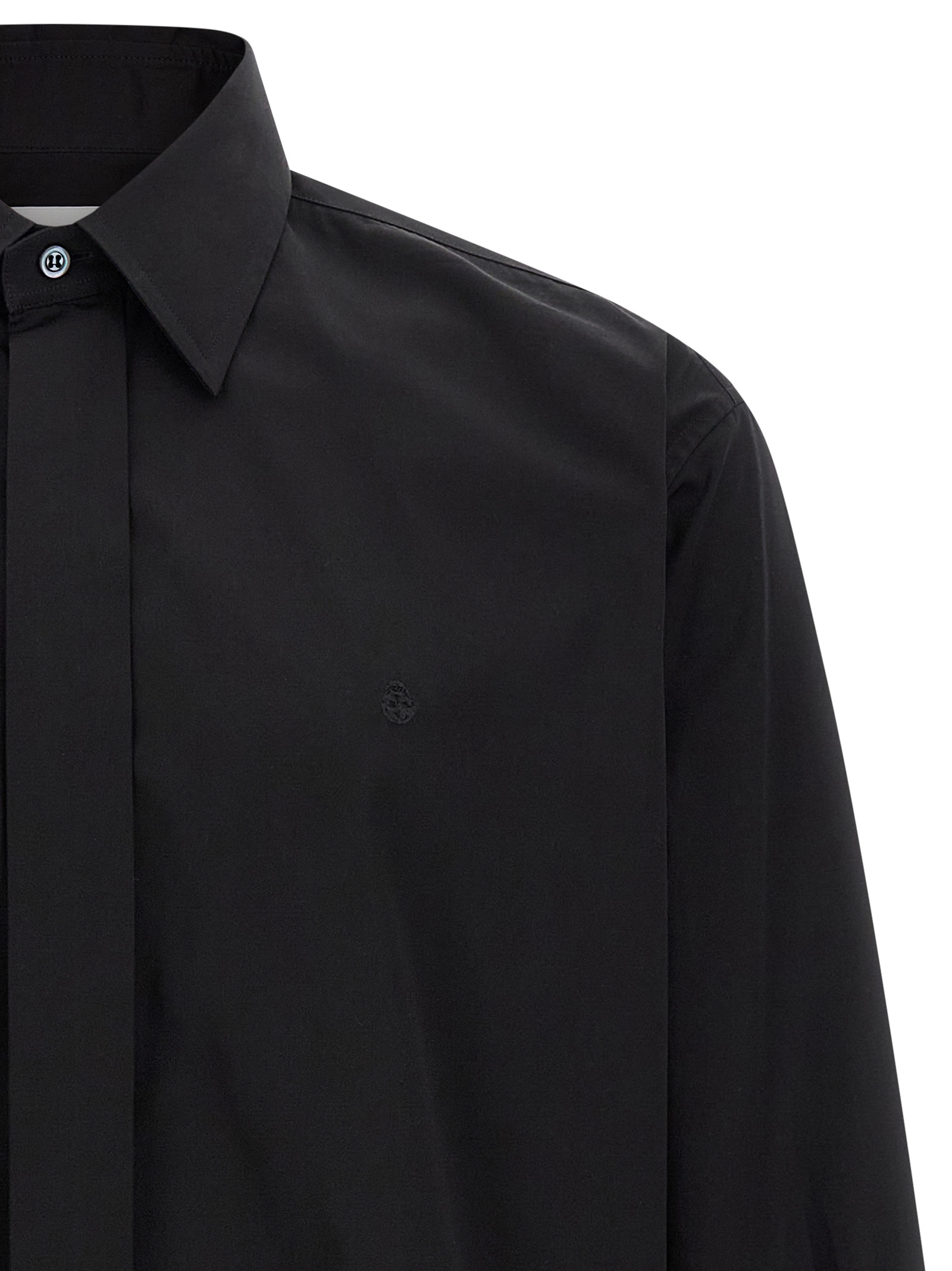 Cotton poplin shirt with tone-on-tone logo embroidery and concealed front button closure, Long cuffed sleeves for cufflinks.