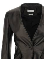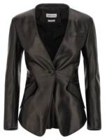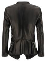 Single-breasted nappa blazer with front button closure and v-neck, Tight waist, Breast pocket, Flap pockets, Long sleeves, Back ruffle, And asymmetric hem. Size and Fit – true to size fit