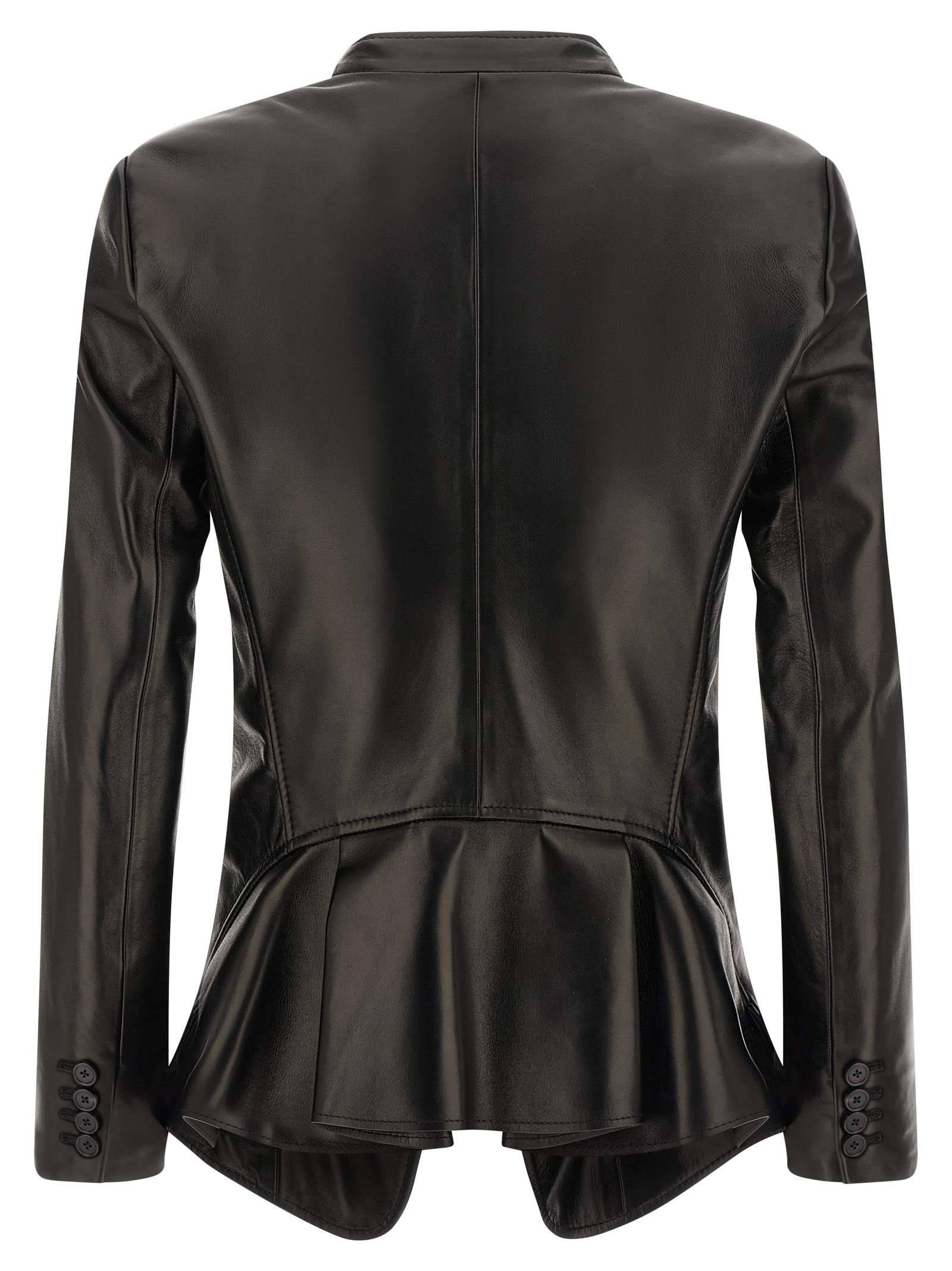 Single-breasted nappa blazer with front button closure and v-neck, Tight waist, Breast pocket, Flap pockets, Long sleeves, Back ruffle, And asymmetric hem. Size and Fit – True to size fit