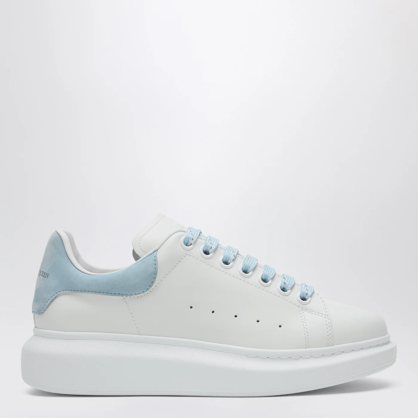 Alexander McQueen sneakers in smooth white calfskin featuring a rounded toe powder blue suede heel with logo lettering flat lace closure and oversized rubber sole. The laces may differ from those in the product image.