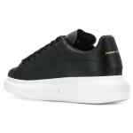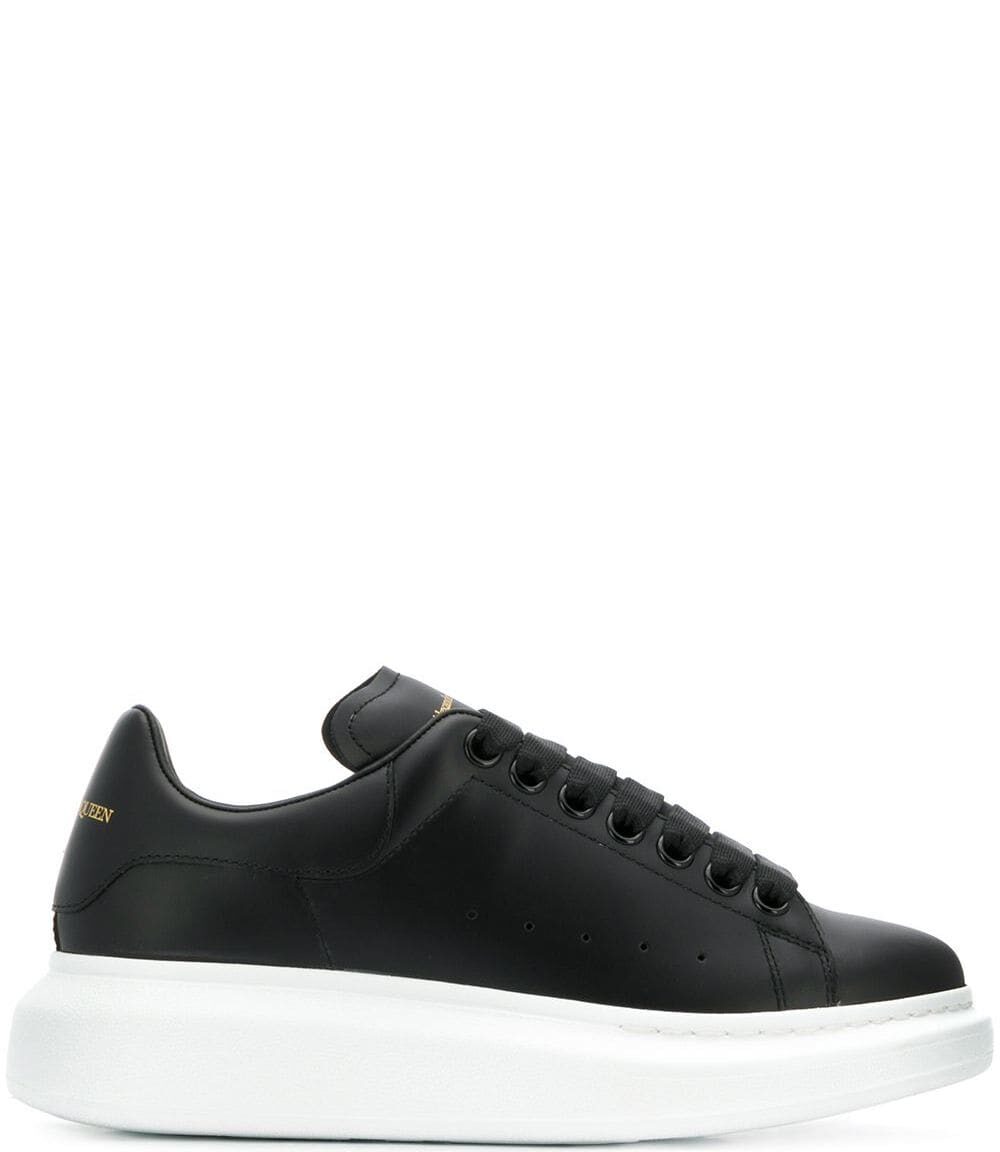 Black leather Oversized low-top sneakers from Alexander McQueen featuring branded heel counter, logo-print tongue, round toe, front lace-up fastening and flat rubber sole. Oversized leather sneakers