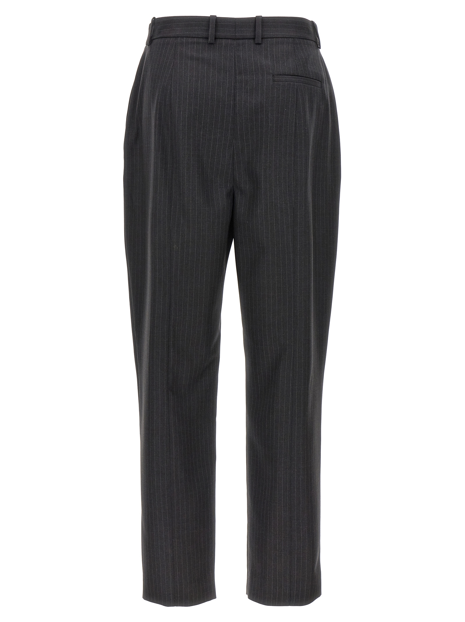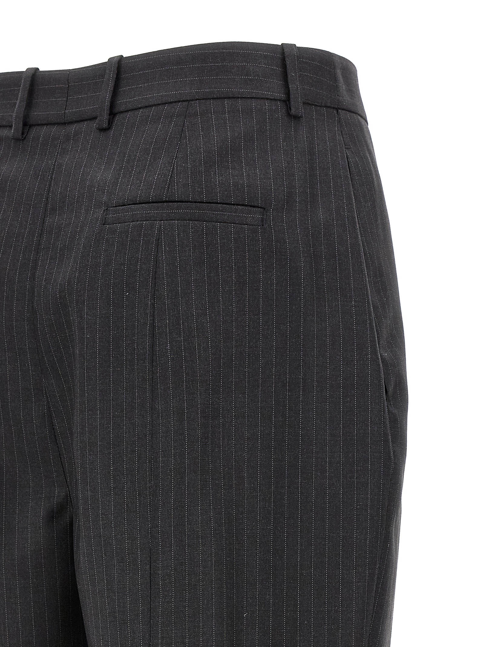 Pinstripe wool pants, Hook and button zip closure, Pockets, Ironed pleat.