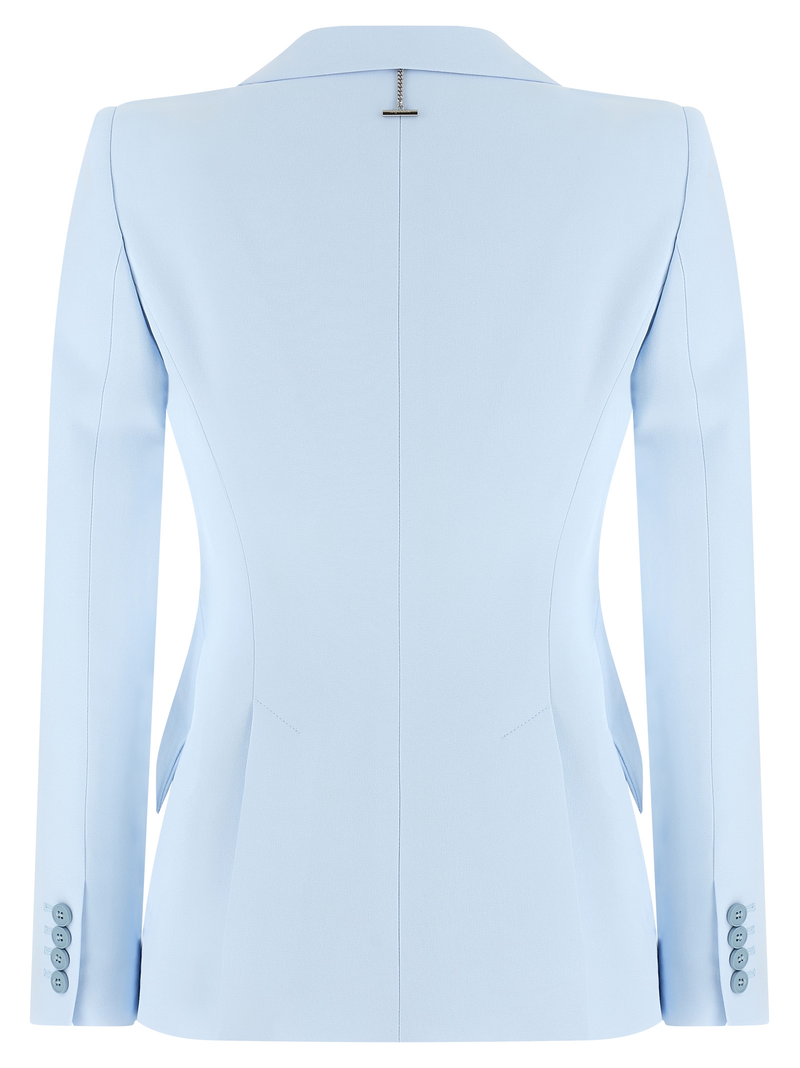 Single-breasted thin crêpe blazer with front button closure, Hourglass silhouette, Mirror lapels, Breast pocket, Flap pockets, Structured and padded shoulder strap, Long sleeves, Chain with metal t-detail and back split, Lining.