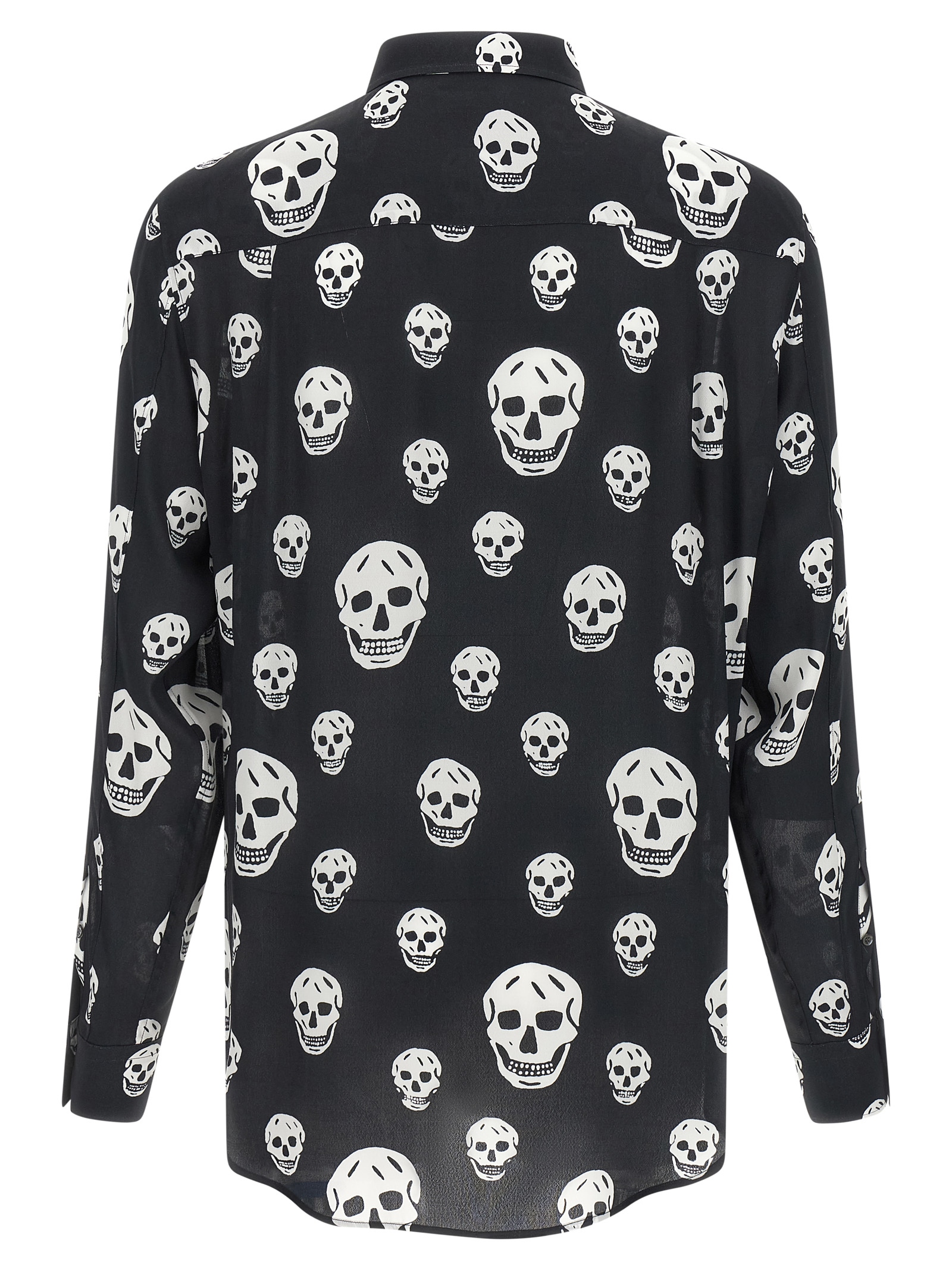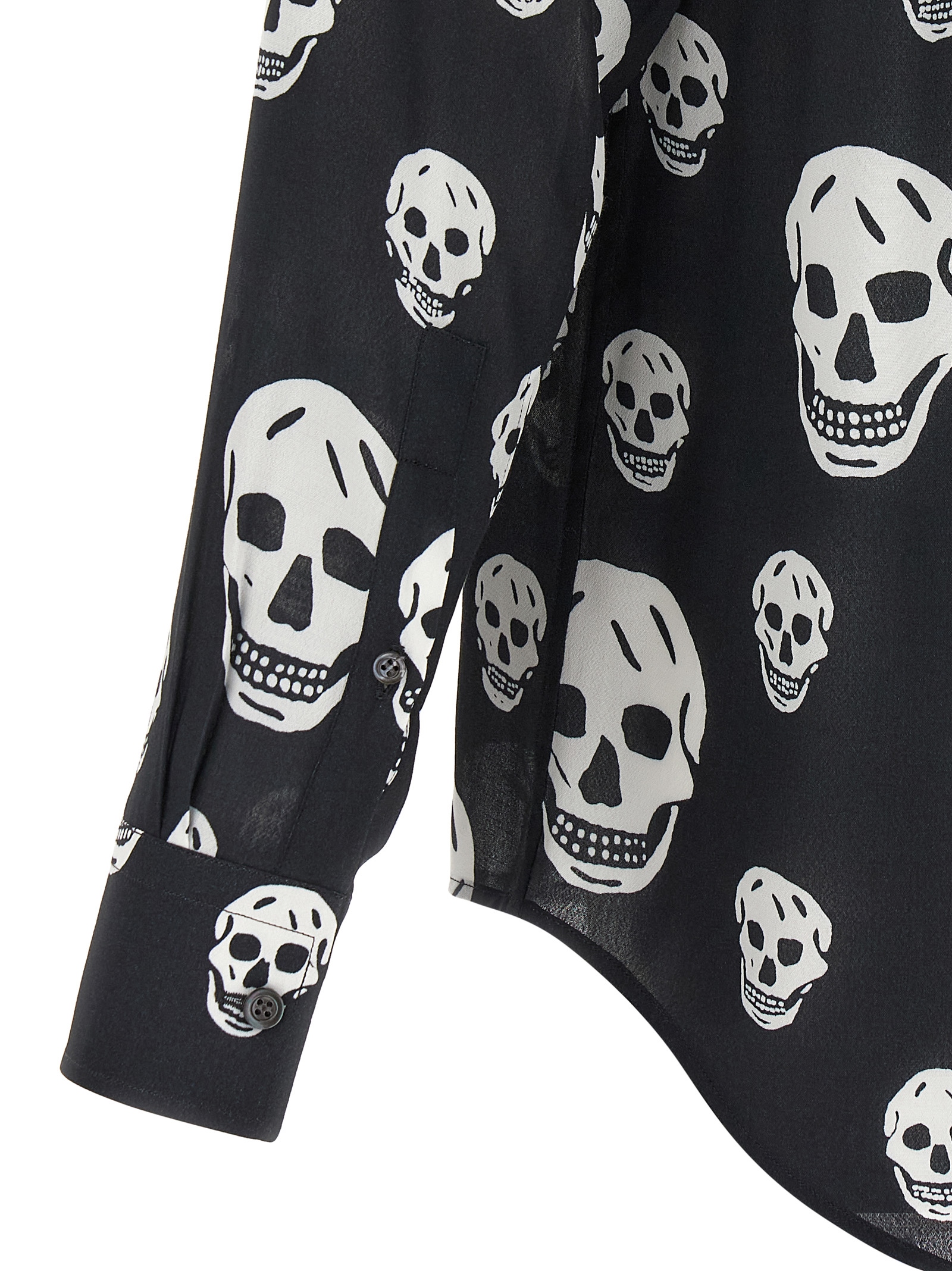All-over ‘skull’ print crepe de chine and viscose shirt, Front button closure, Long cuffed sleeves, And asymmetrical hem.