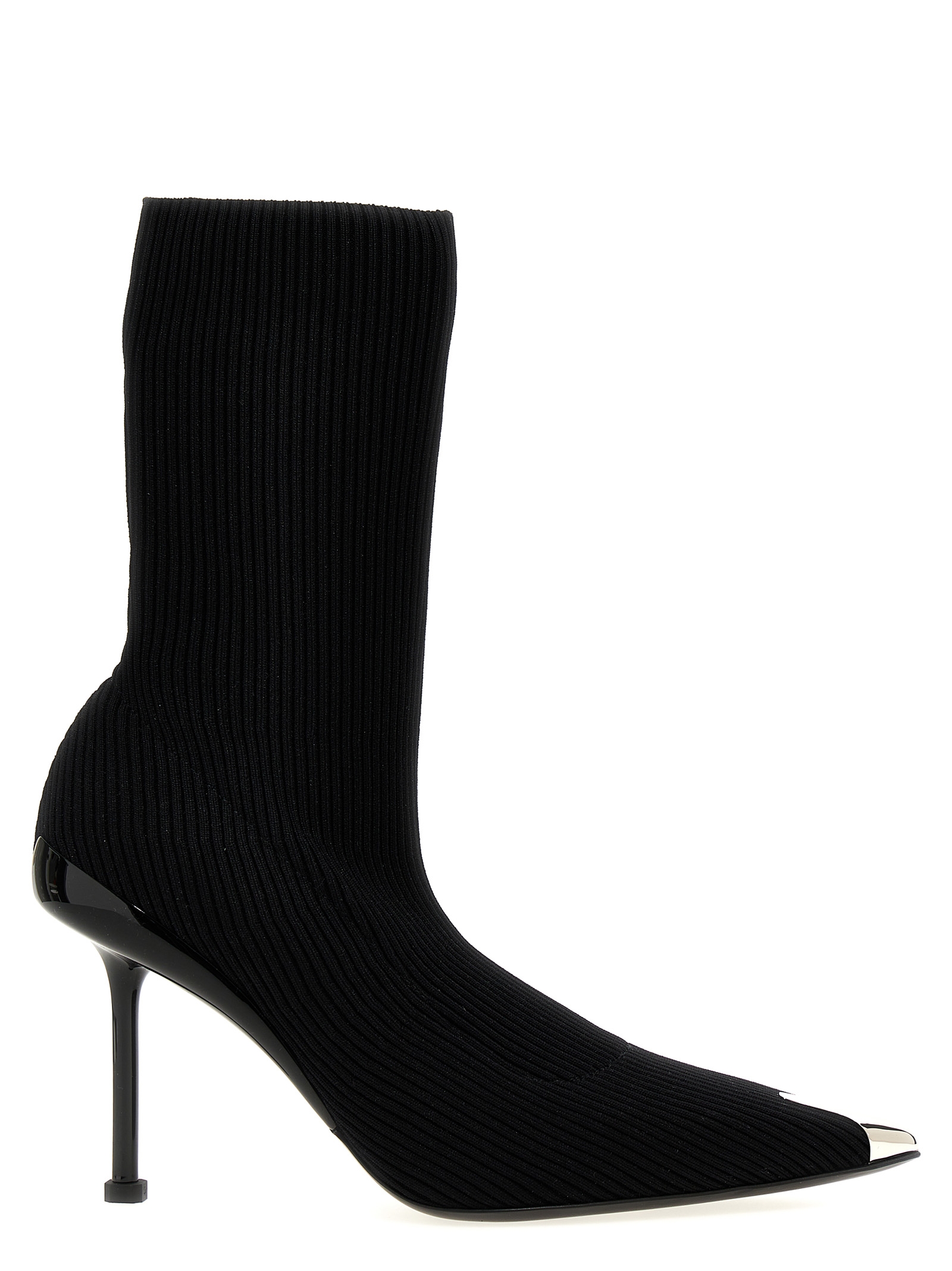 ‘slash’ ribbed knit ankle boots with silver metal punk-style toe, Tone-on-tone lacquered heels with cut-out and a silver soul.
