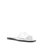 silver-tone calf leather smooth grain metallic finish square open toe logo-embossed strap branded leather insole flat leather sole slip-on style Seal leather sandals