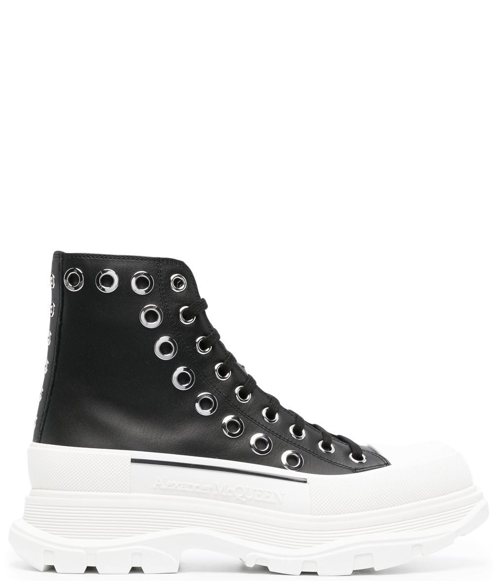 Nero/bianco, pelle di vitello, dettaglio con occhiello metallico, linguetta con logo stampato, logo laterale goffrato, punta a contrasto, chiusura frontale con lacci, suola chunky in gomma e altezza alla caviglia. Tread Slick ankle boots