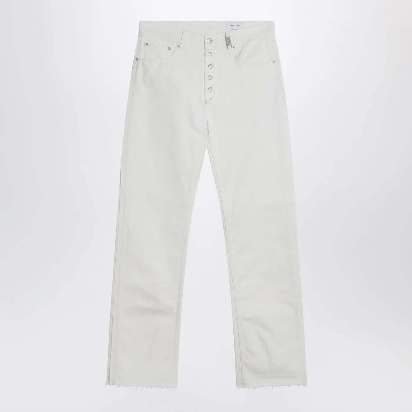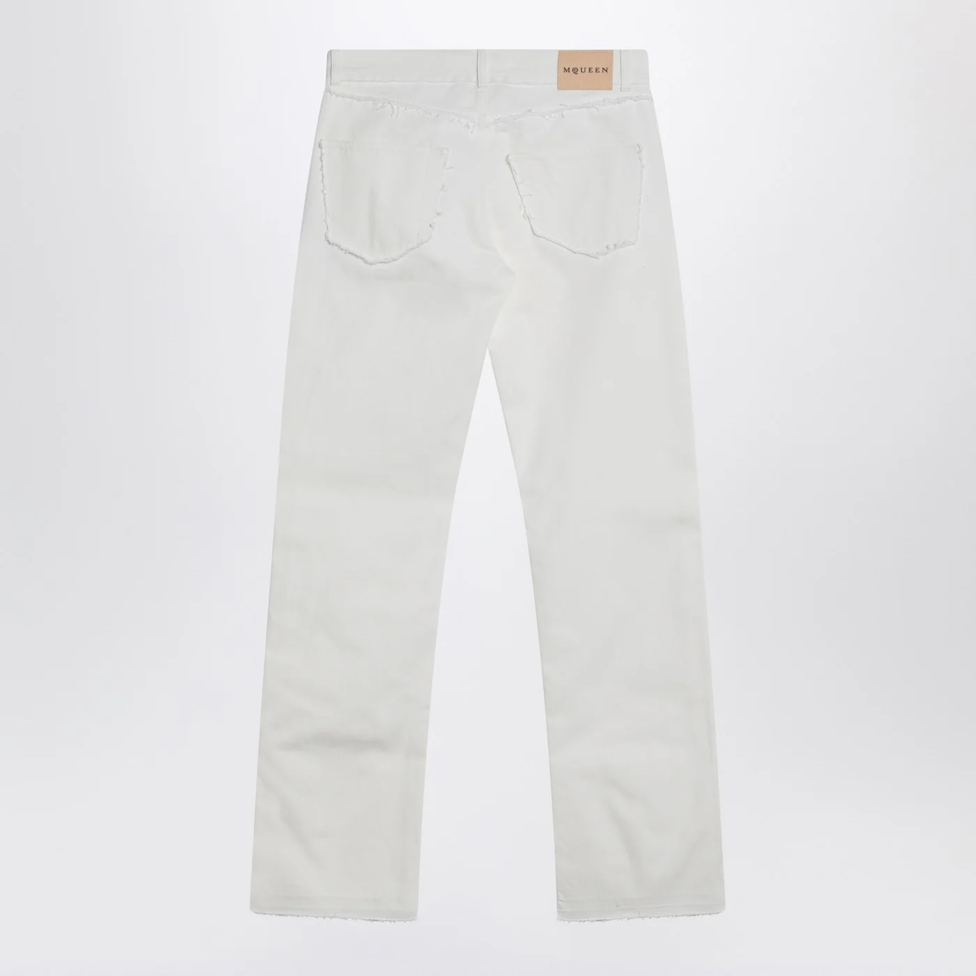 Alexander McQueen white cotton denim pants featuring belt loops with one having a metallic logo detail front button closure five classic pockets back logo patch frayed details and raw hem.
