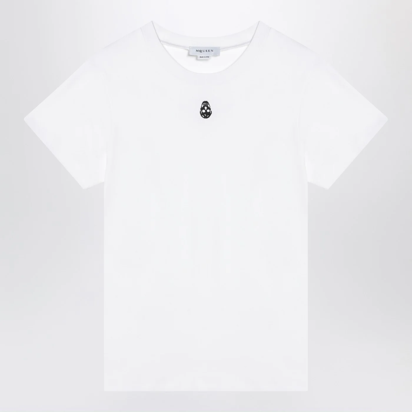 White cotton crew neck T-shirt by Alexander McQueen featuring short sleeves and a contrasting inverted Skull embroidery on the front.