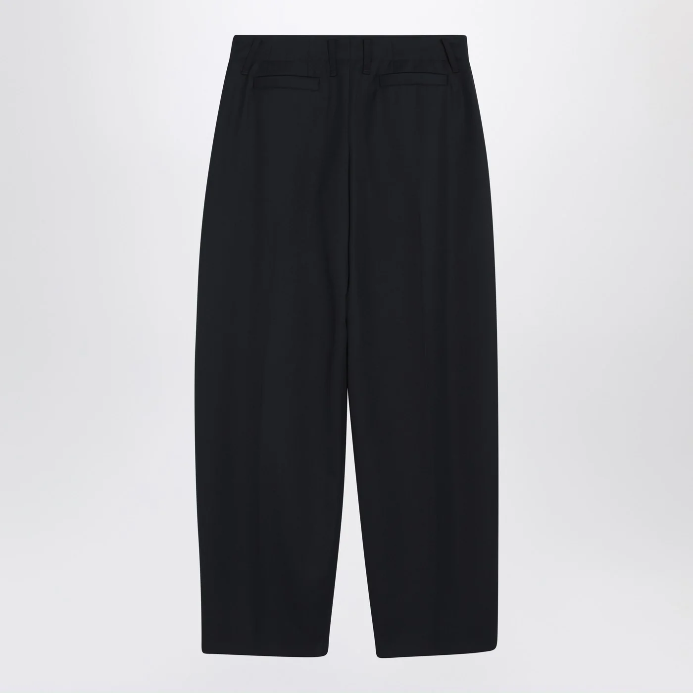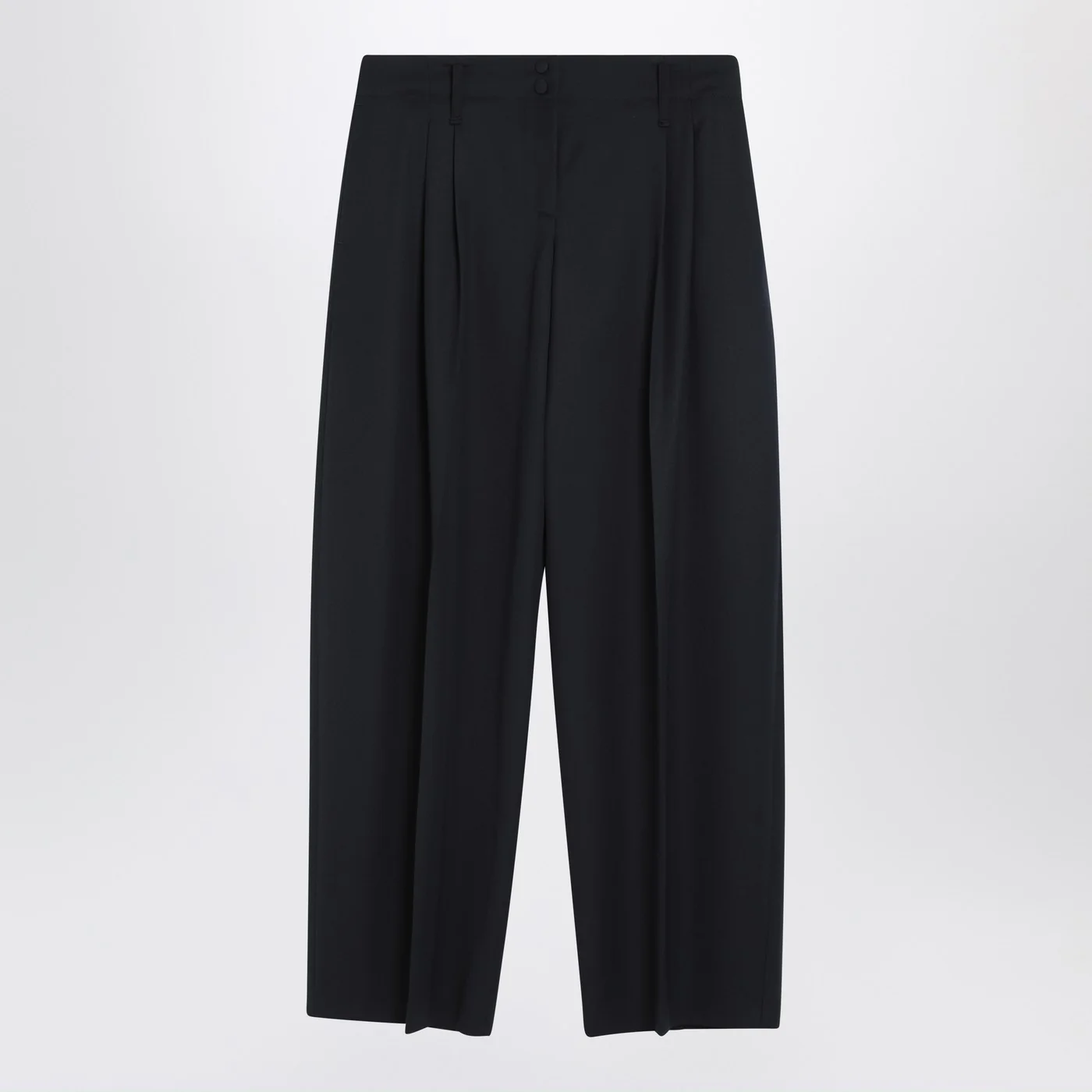 Navy blue wool trousers by Alexander McQueen featuring a high waist with belt loops front zip closure with double button two side welt pockets front pleats two back welt pockets and wide leg.