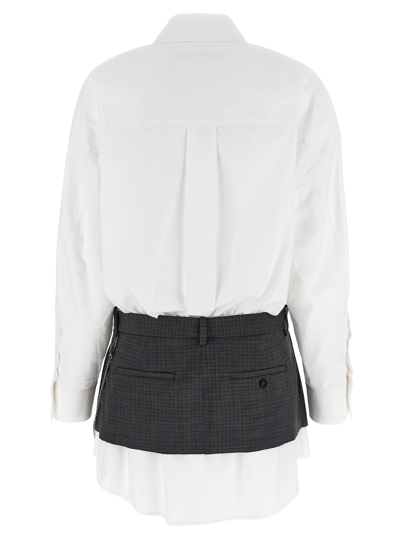 ‘pre-styled shirt dress w chain’ cotton dress, Oversized shirt model with overlapping skirt, Shirt with front button closure, Breast pocket with tone-on-tone embroidered logo, Long sleeves with cuffs and dropped shoulder and mini skirt in flounced melange wool, Zip hook and front button closure, Pockets, Chain with removable charm. Size and Fit – true to size fit – US sizing