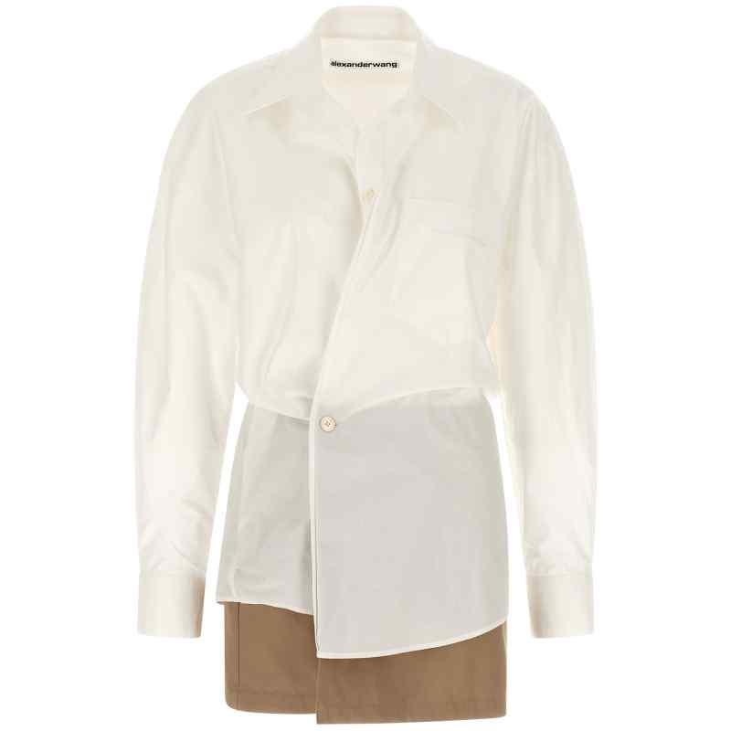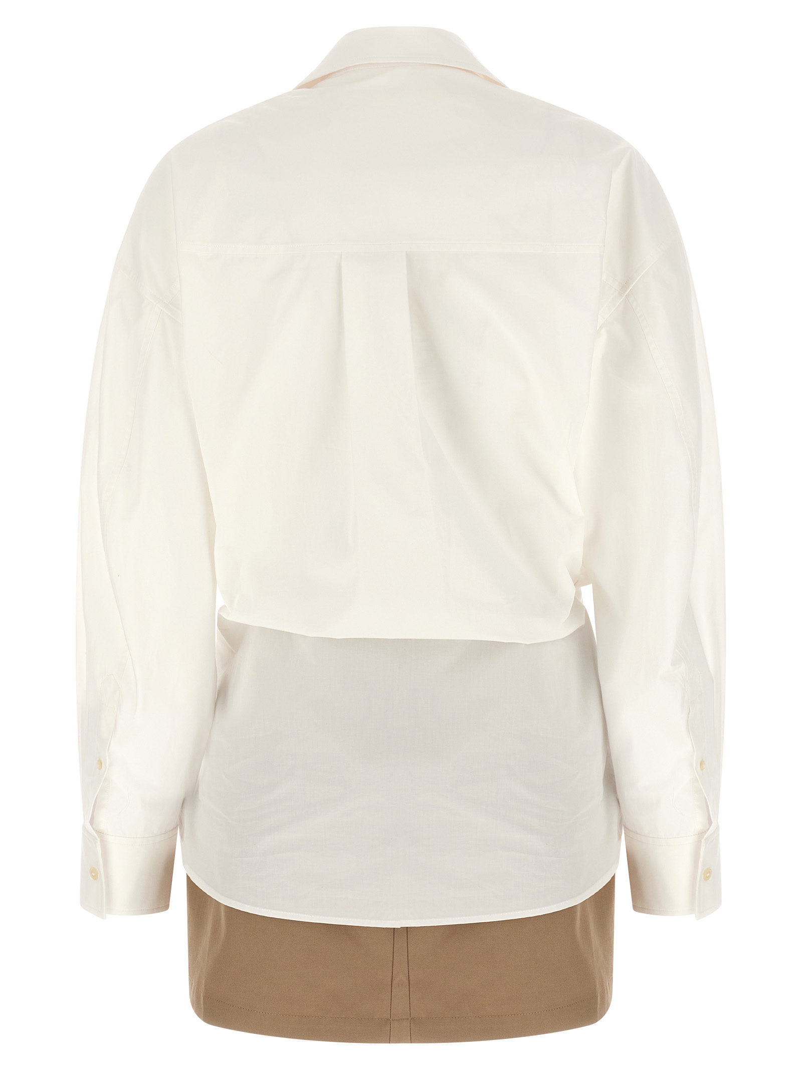Mini ‘pre-styled wrap dress’ dress consisting of canvas mini skirt with wallet closure and cotton poplin shirt, Front pocket with logo embroidery, Collar, Button closure, Long sleeves with cuffs.