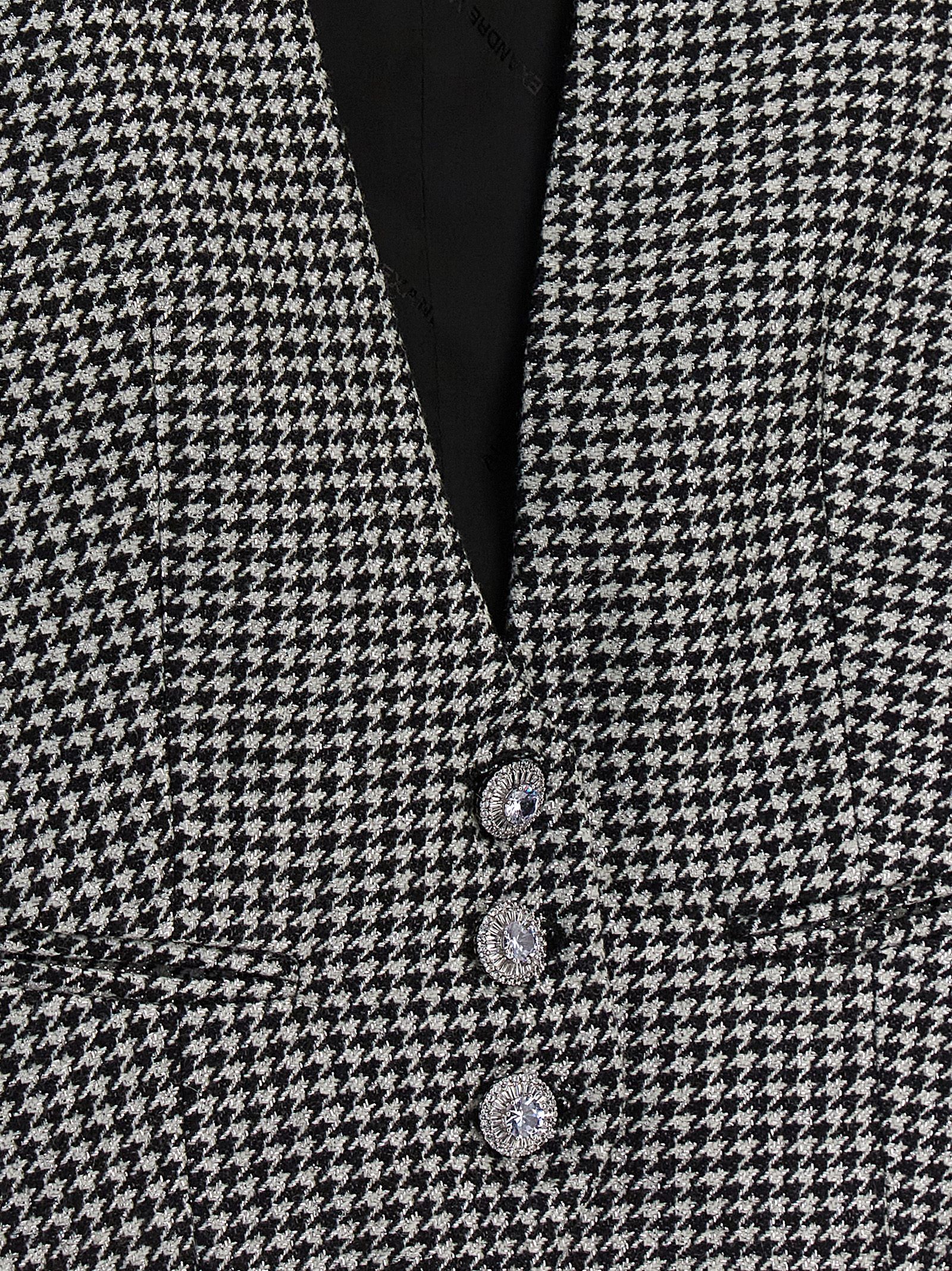 Houndstooth wool blend waistcoat with lurex detail, jewel button closure, chest pockets.