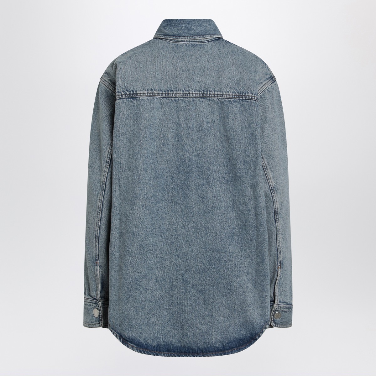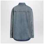 Ami Paris indigo used-effect cotton denim shirt jacket, featuring a front button closure, long sleeves with buttoned cuffs, tobacco-coloured Ami de Coeur patch on the chest, contrast stitching, and a curved hem.