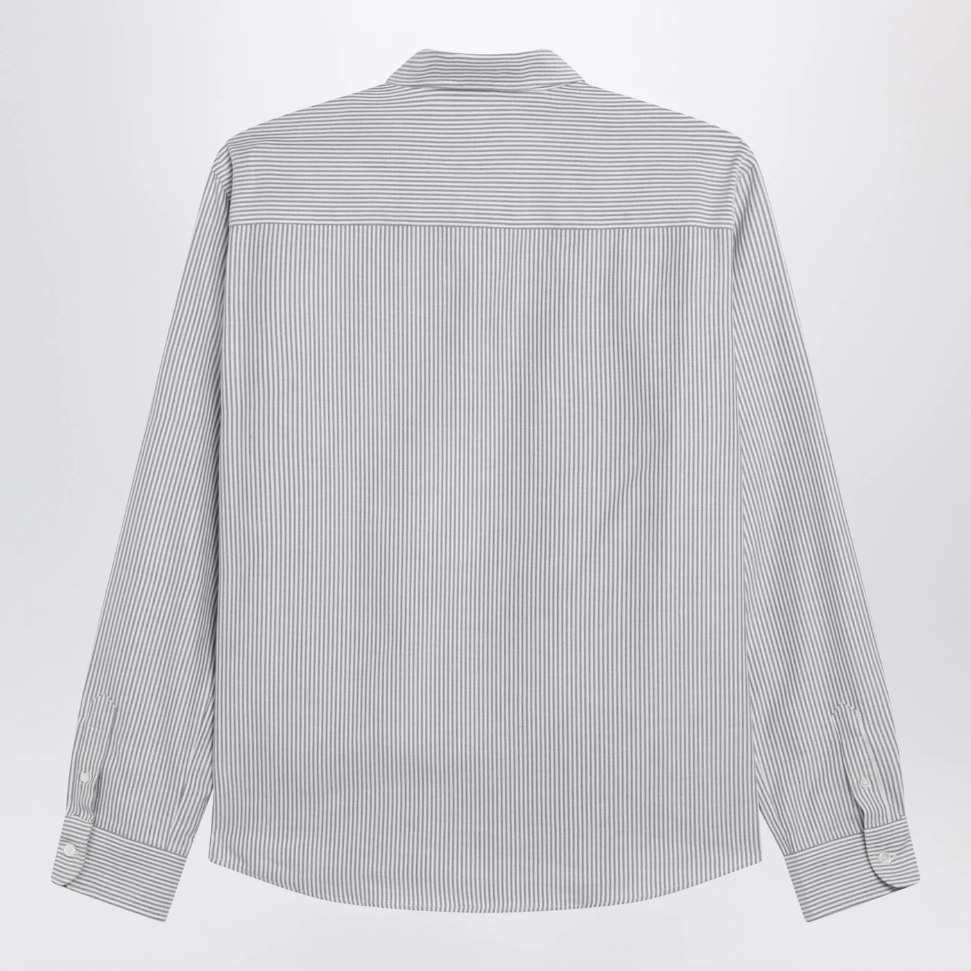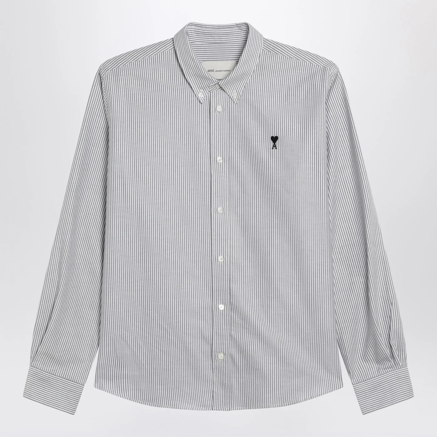 Ami Paris white striped cotton shirt featuring a button-down collar long sleeves with buttoned cuffs contrasting Ami De Coeur embroidery on the chest and a curved hem.
