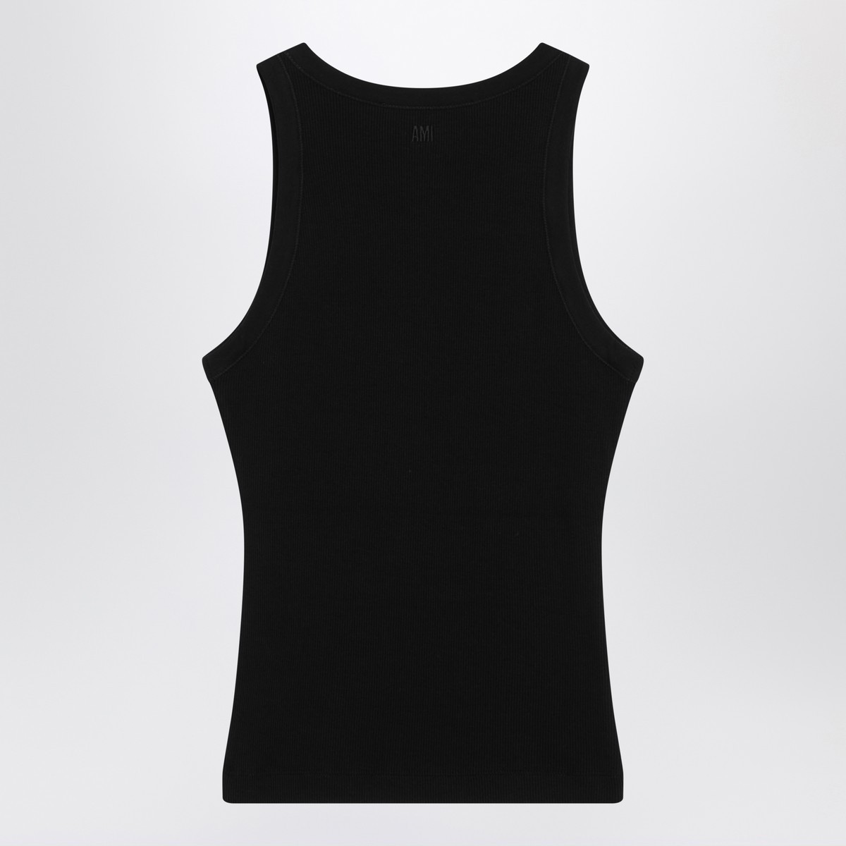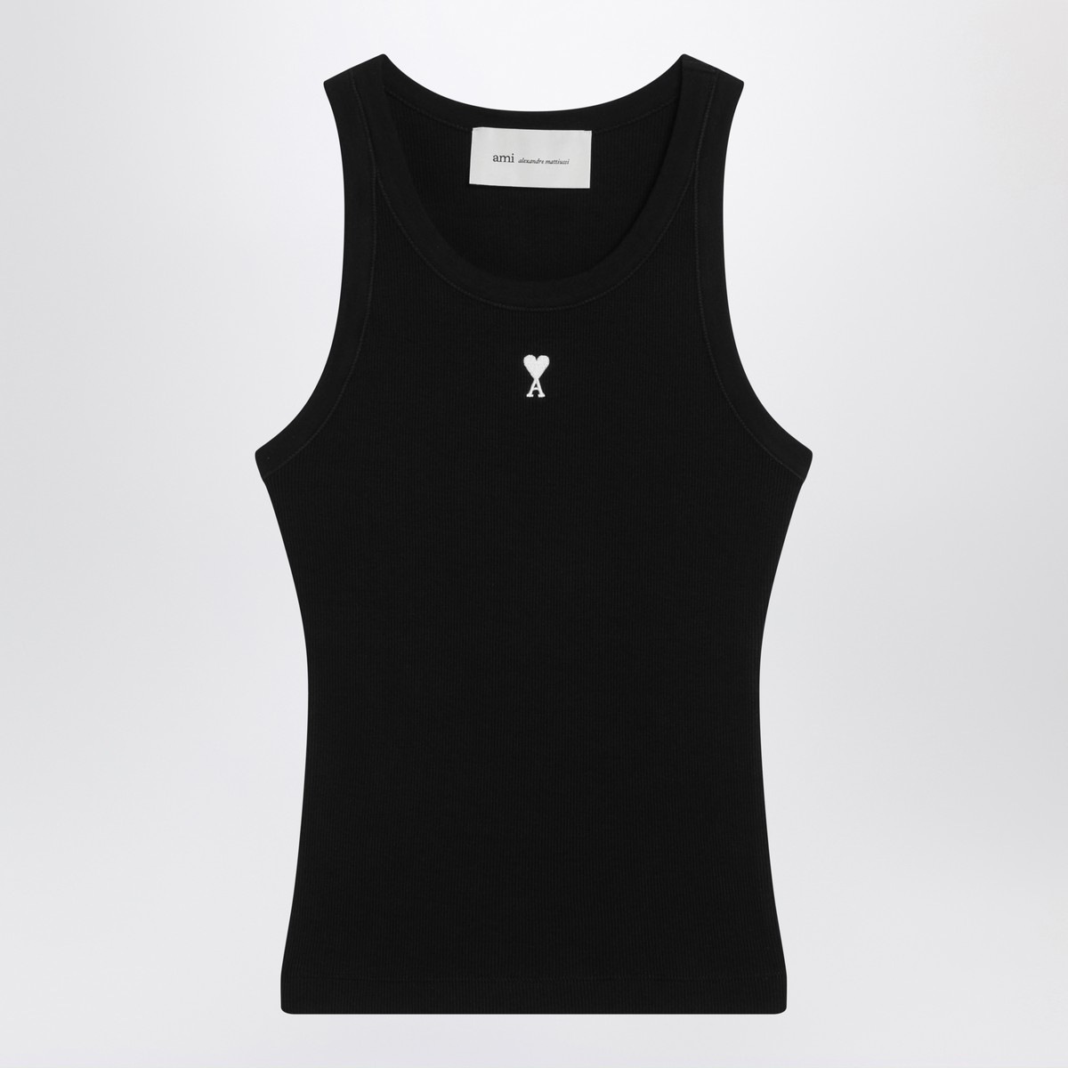 Ami Paris black cotton crew-neck tank top featuring a fitted ribbed design and contrasting Ami de Coeur logo embroidery on the front.