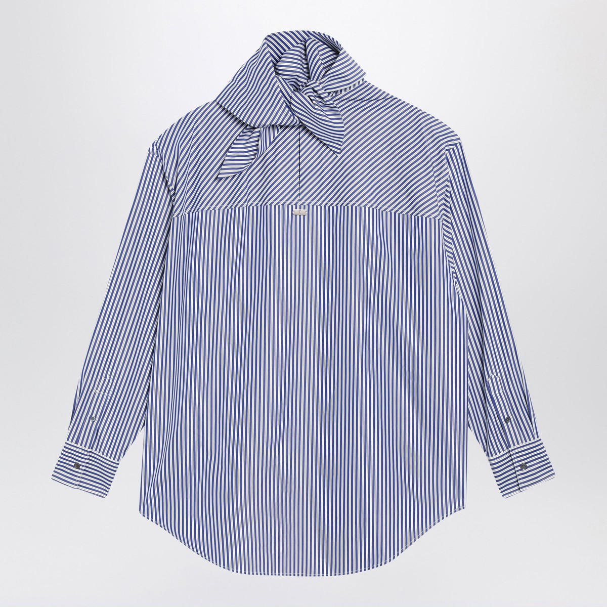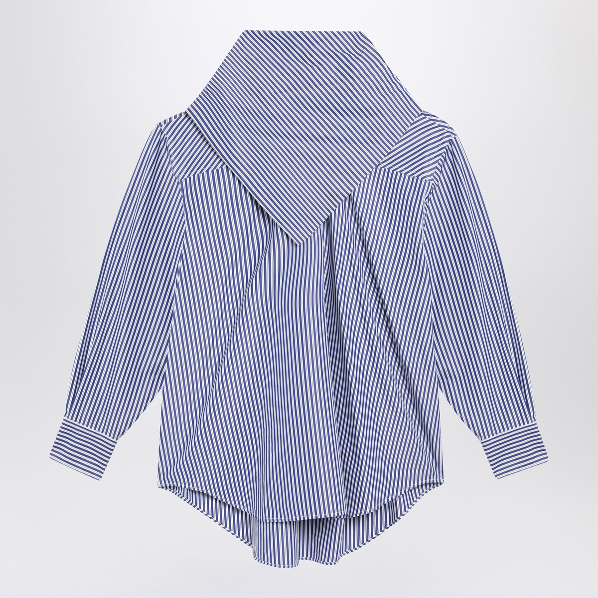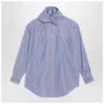 Ami Paris shirt in blue and white striped cotton poplin, characterized by an oversized fit, integrated scarf collar, long sleeves, buttoned cuffs, and a curved hem.