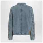 Ami Paris jacket in blue cotton denim with a faded effect, characterized by a front closure with double zip, long sleeves with buttoned cuffs, a patch pocket on the chest with contrasting Ami de Coeur embroidery, two side pockets, and a back logo patch.