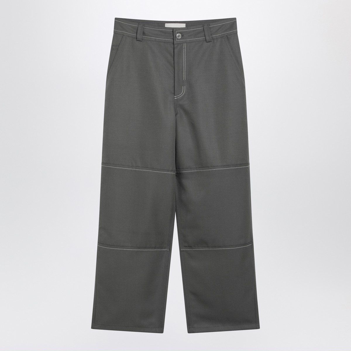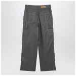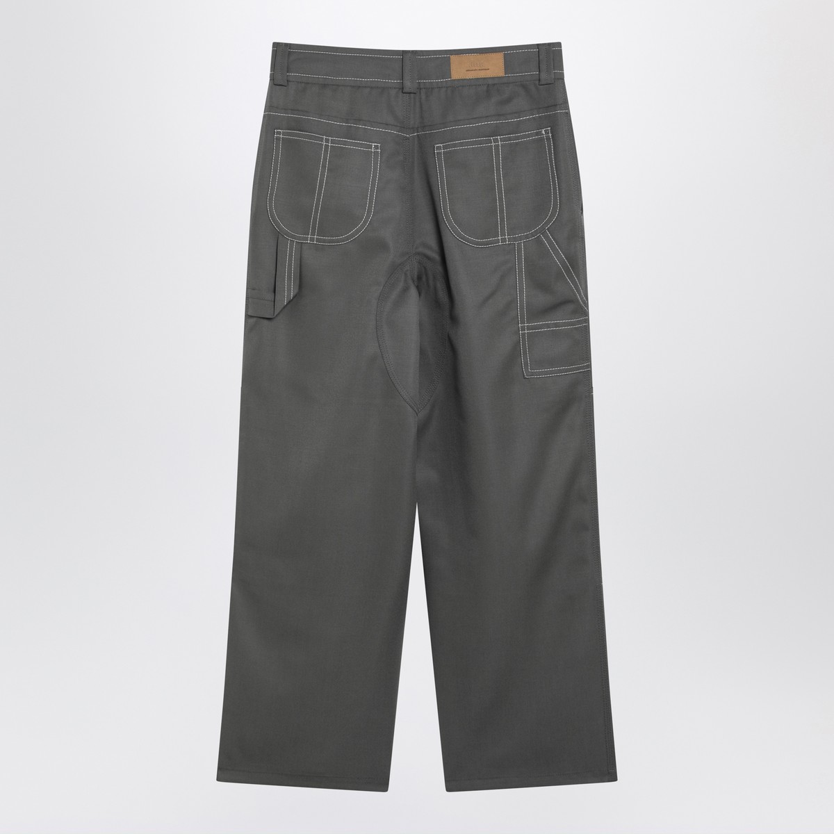 Ami Paris grey wool canvas workwear trousers featuring a wide cut, belt loops, front zip and button fastening, contrasting stitching, two side pockets, two rear pockets and a rear logo patch.