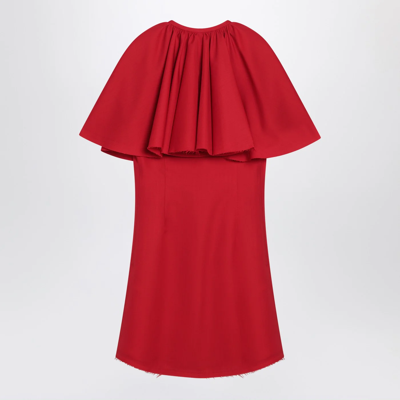 Mini round-neck dress by Ami Paris in virgin wool red characterized by hidden front buttoning flared cape design with ruffles and a curved raw-cut hem.