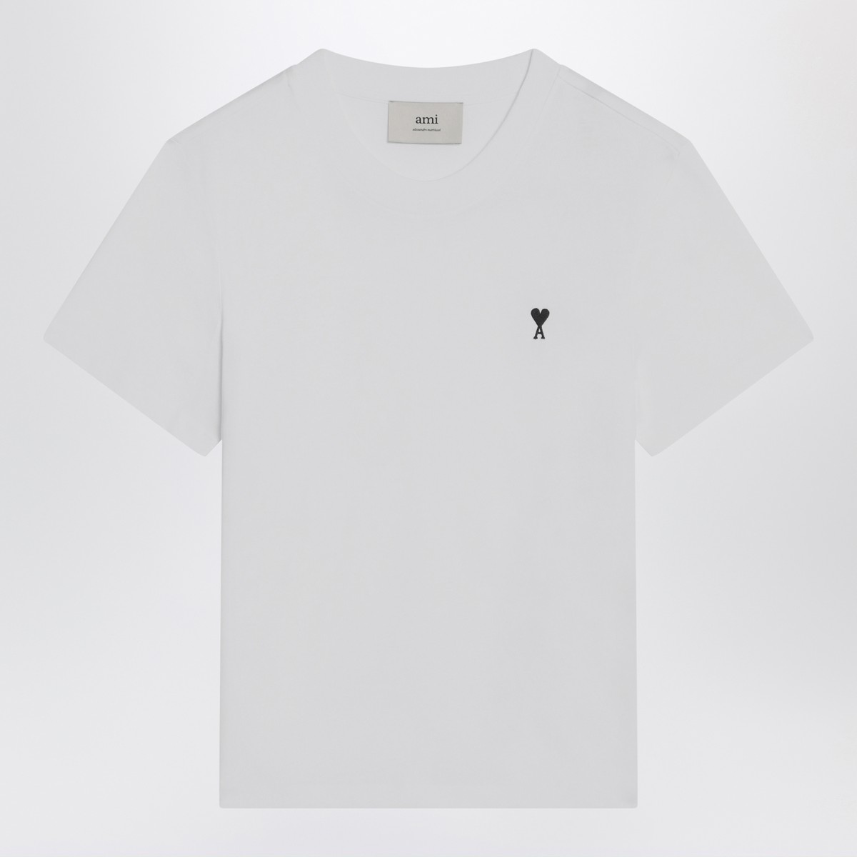 Ami Paris white cotton T-shirt, featuring short sleeves, ribbed crew neck, and contrasting Ami De Coeur logo embroidery on the chest.