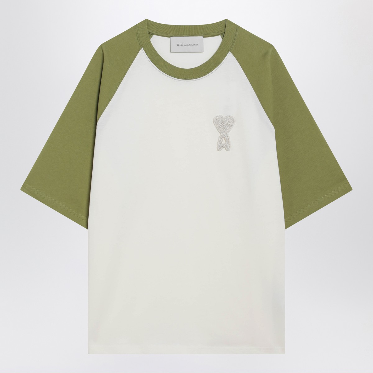 T-shirt by Ami Paris in cream white and matcha green cotton, featuring short sleeves, a ribbed crew neck and a tone-on-tone raised Ami de Coeur logo on the chest.