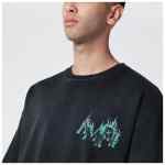 Amiri T-shirt in black vintage-effect cotton, featuring short sleeves with dropped shoulders, contrasting flame logo print on chest and back, ribbed crew neck, and oversized relaxed fit.