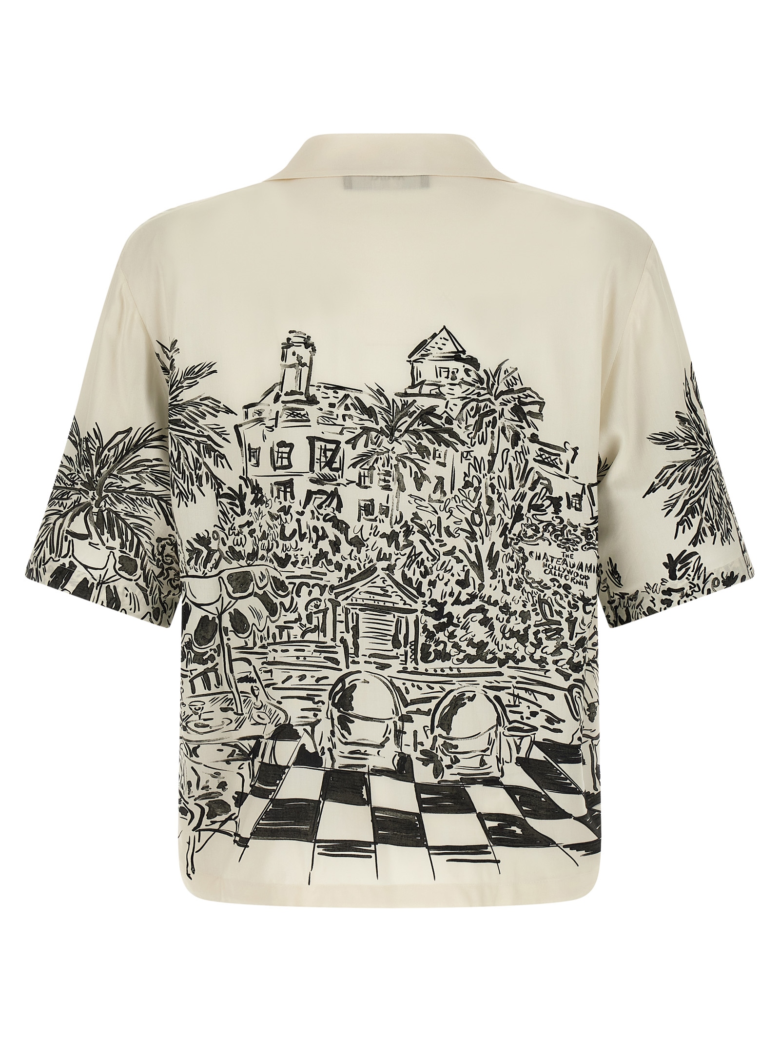 ‘chateau sketch’ patterned silk bowling shirt, Logo embroidery and front mother-of-pearl button closure, Short sleeves. With dropped shoulders.