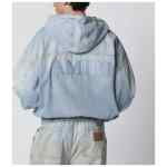 Amiri light blue washed cotton denim bomber jacket, featuring front zip closure, vintage-effect design, long sleeves with dropped shoulders, drawstring hood, visible stitching, front pockets, elasticated cuffs and hem, logo on the chest and logo lettering on the back.