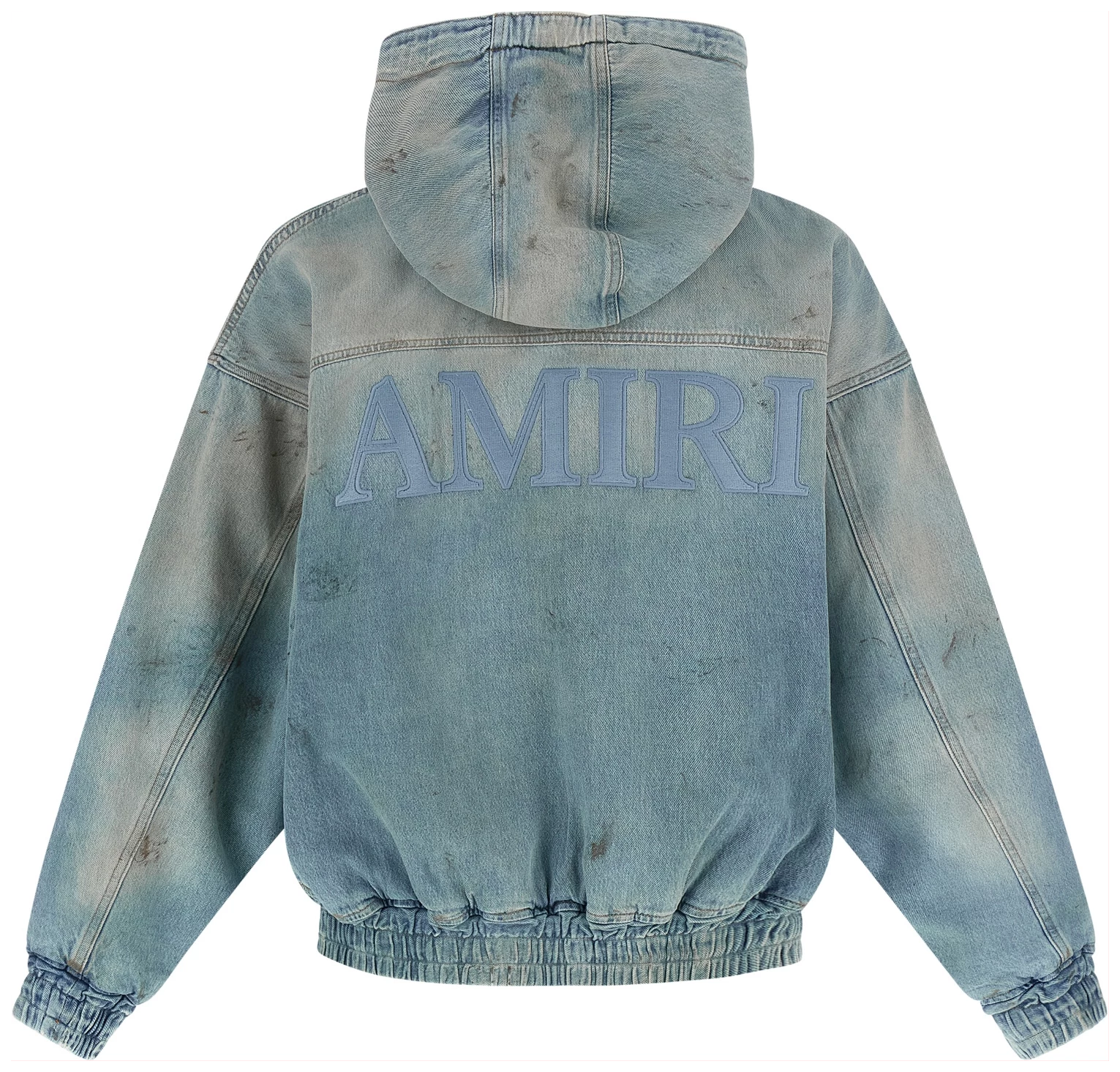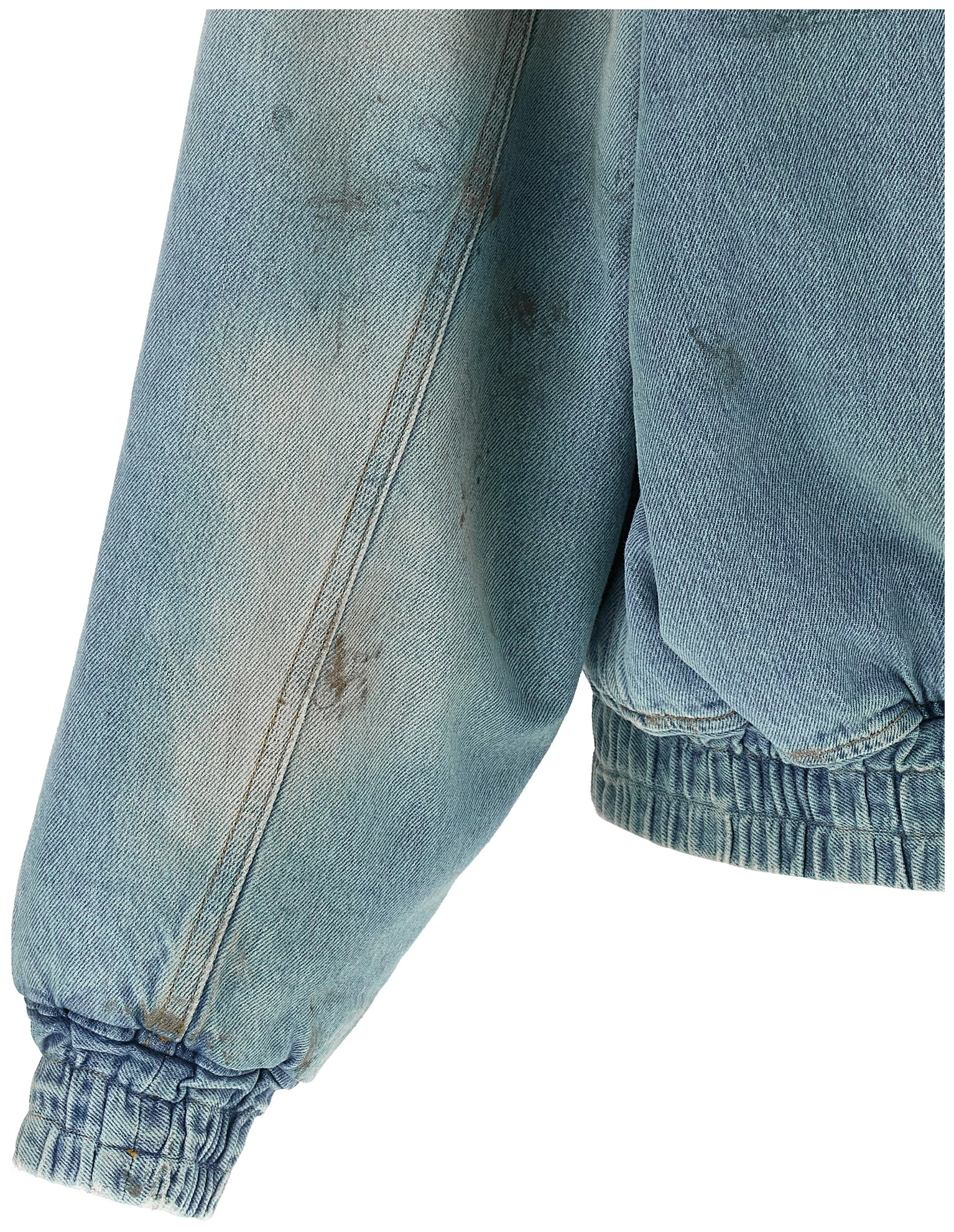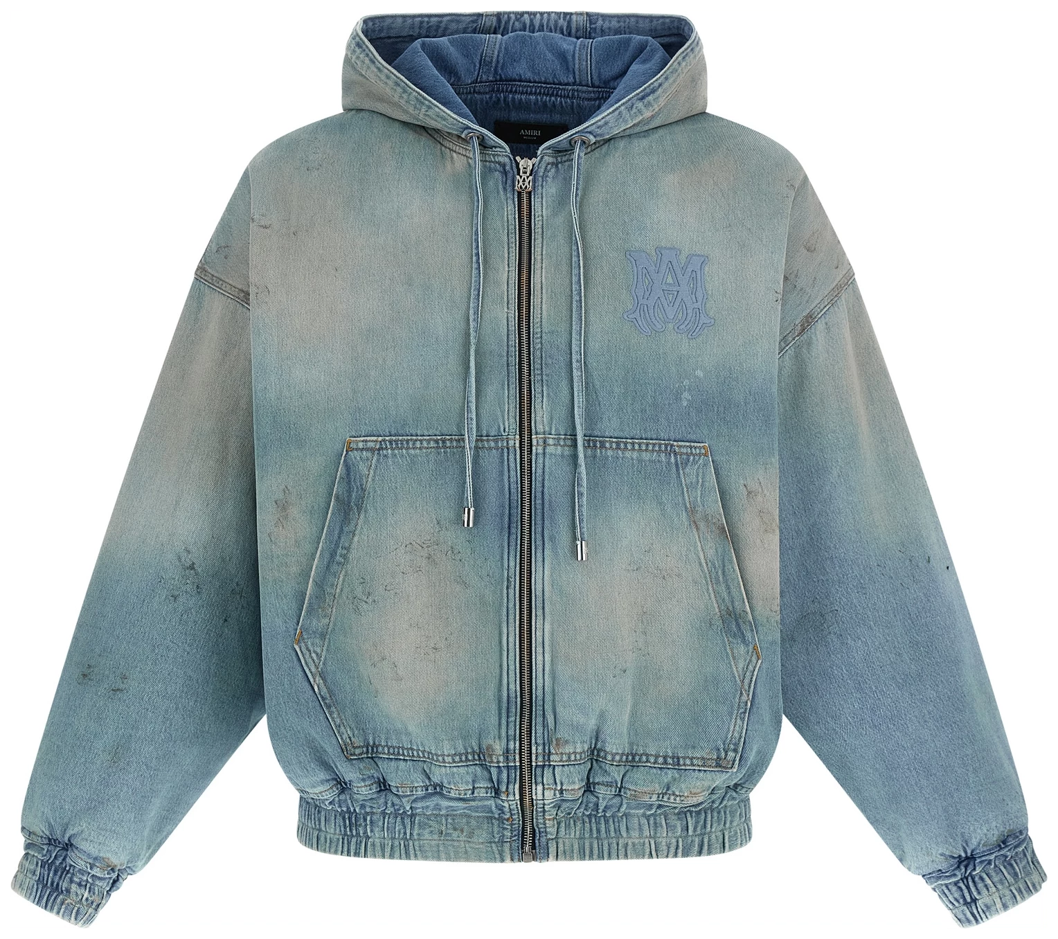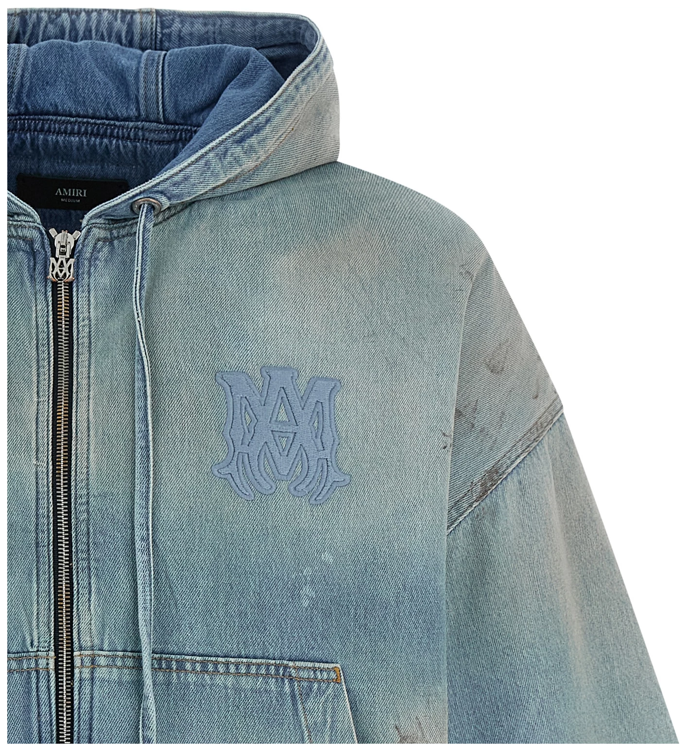 ‘ma denim’ hoodie in used-effect stone washed cotton denim with stains, Contrast stitching, Patch and logo embroidery on the front and back, Front zip closure, Pockets, Long sleeves with elastic cuffs and dropped shoulders, Elastic at the hem, Suede logo tag on the back.