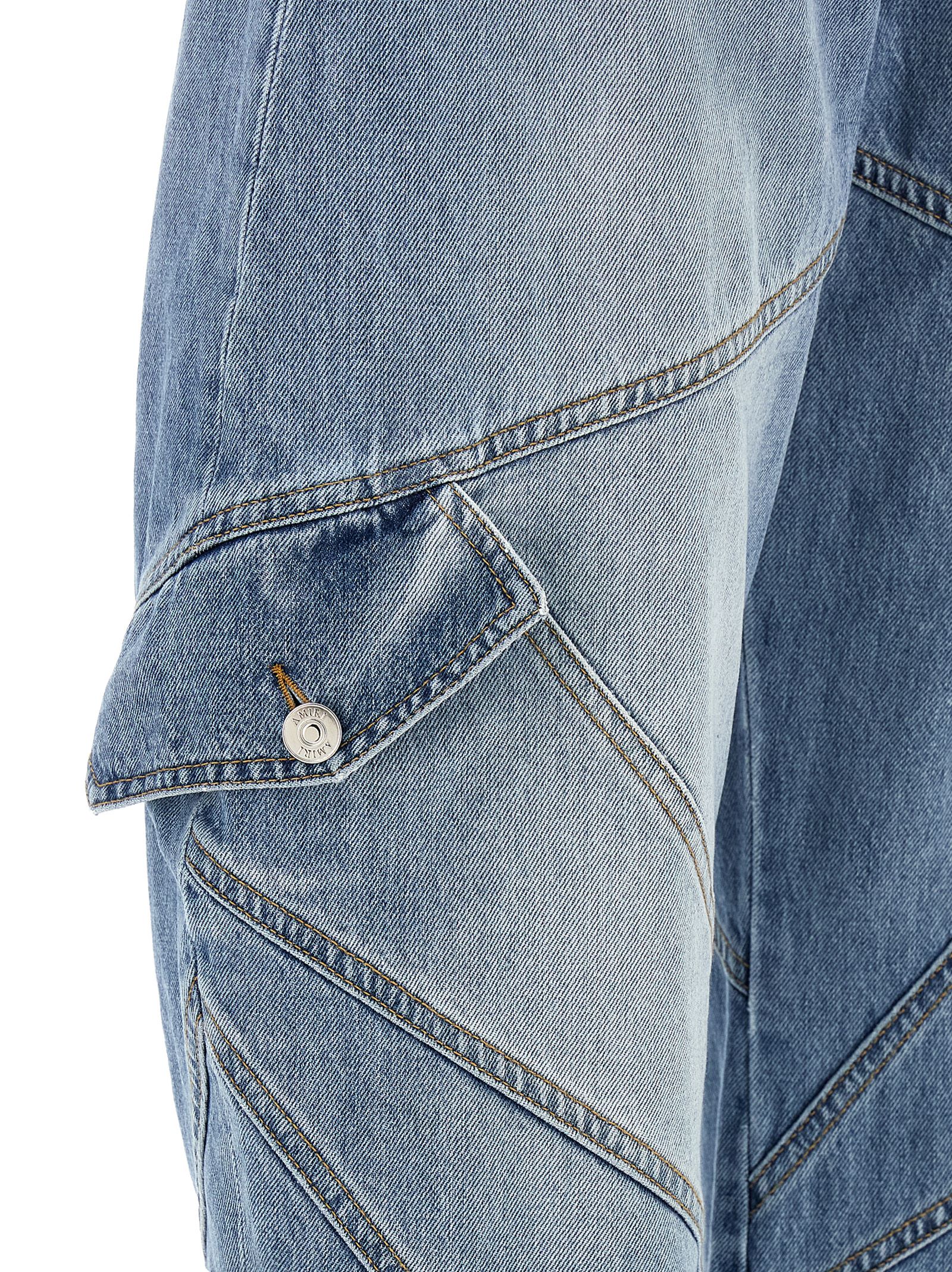 Used-effect stone washed cotton denim jeans, Contrast stitching, Panel construction, Barrel silhouette, Cargo style with sloping pockets, Front button closure, Five pockets, And back logo label.