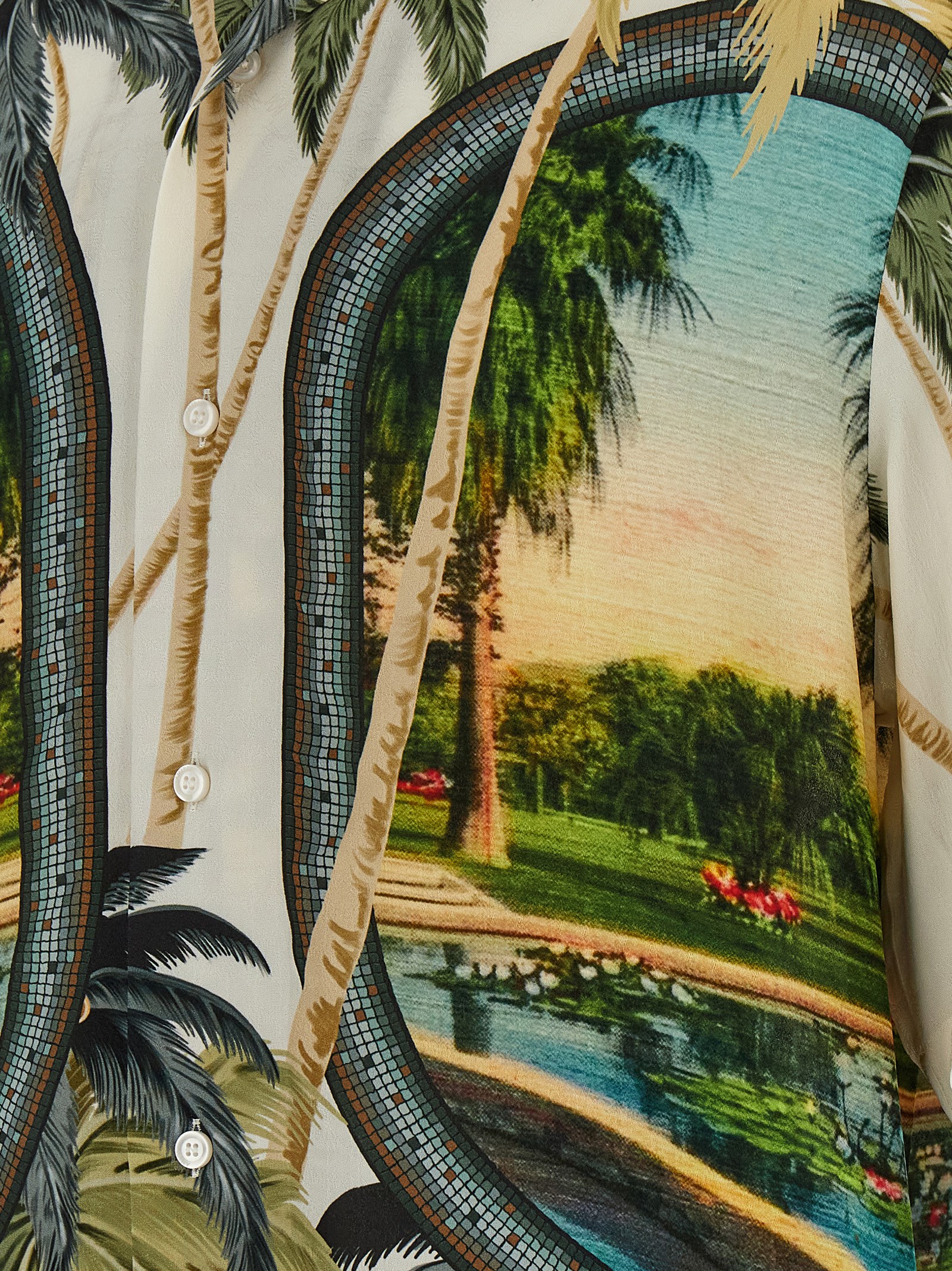 ‘Paradise Bowling’ silk-effect fabric shirt with all-over print, V-neck style with resealable lapels with button, front button closure, short sleeves.