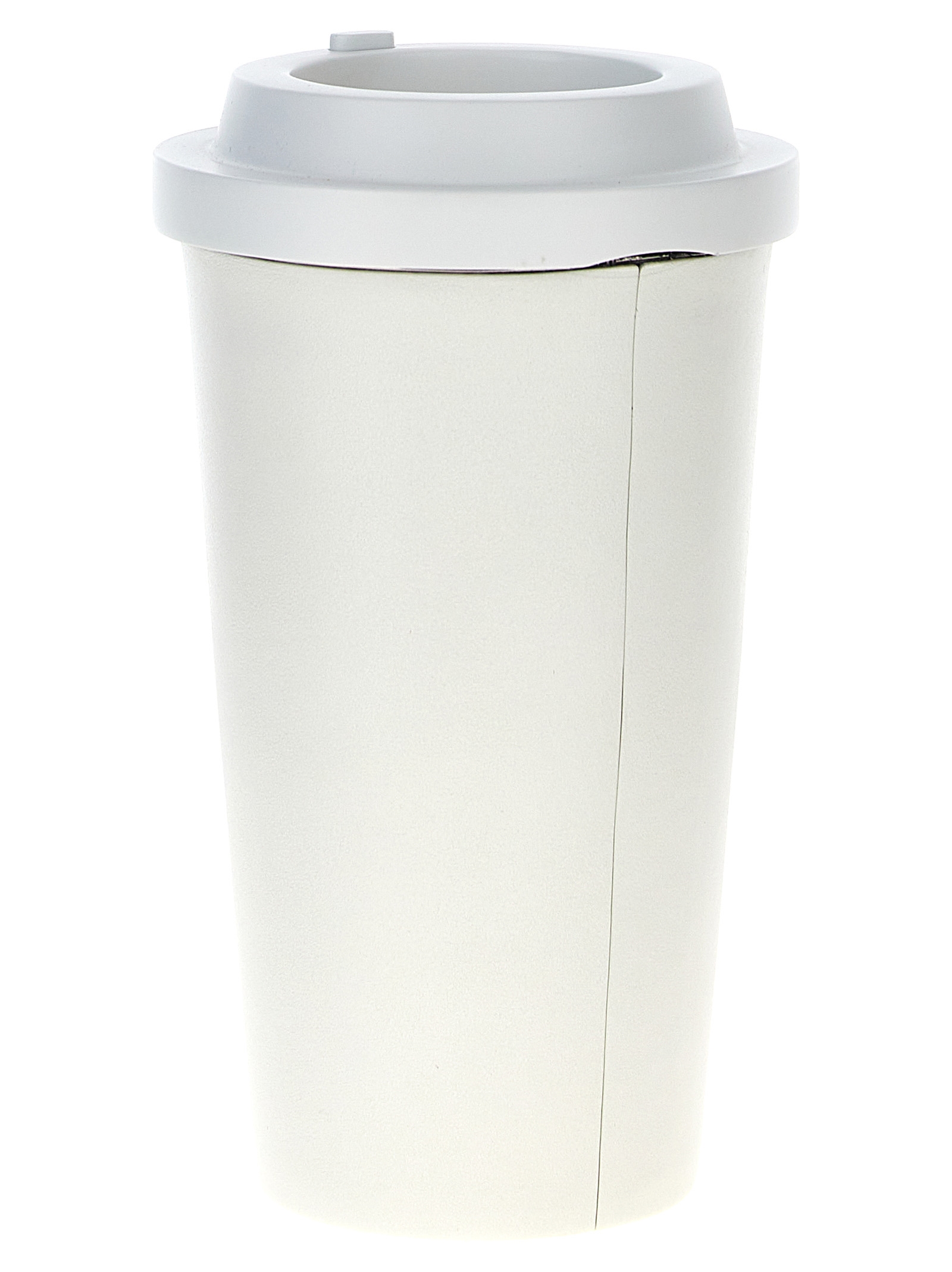 9 AM’ leather clutch in the shape of a coffee cup with top click closure, front logo.