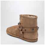 Balenciaga camel leather and synthetic ankle boots featuring rounded toe, studded strap with ABS buckles, embossed logo on the back, and tone-on-tone rubber sole.