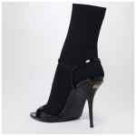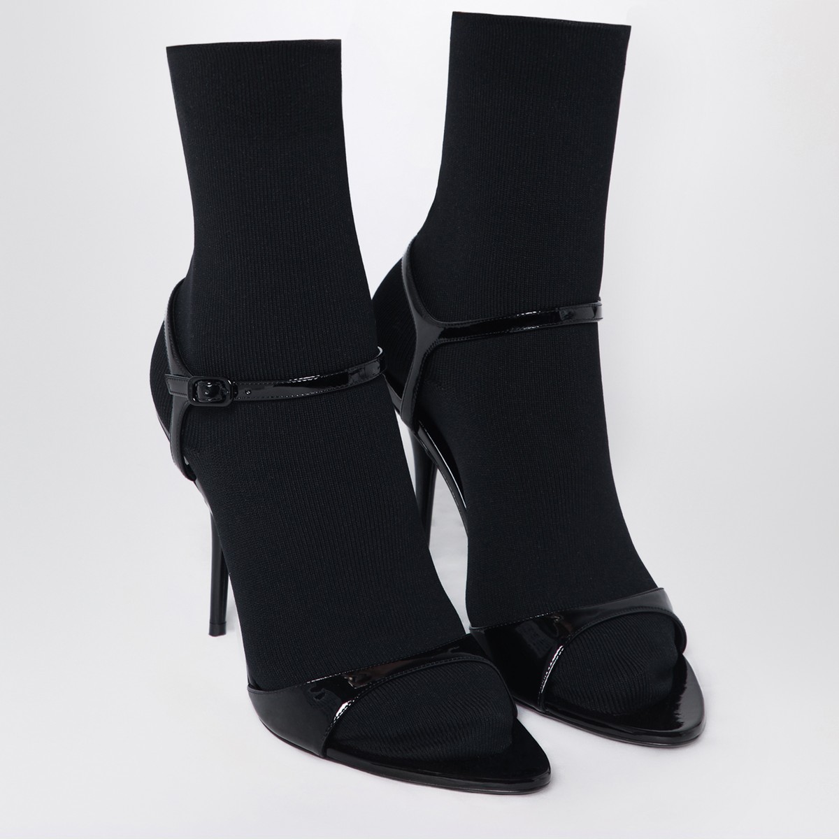 Balenciaga patent leather black calfskin sandal, featuring an adjustable ankle strap closure, integrated black knitted sock, high thin heel with a metal BB logo on the back, open toe, and leather sole.