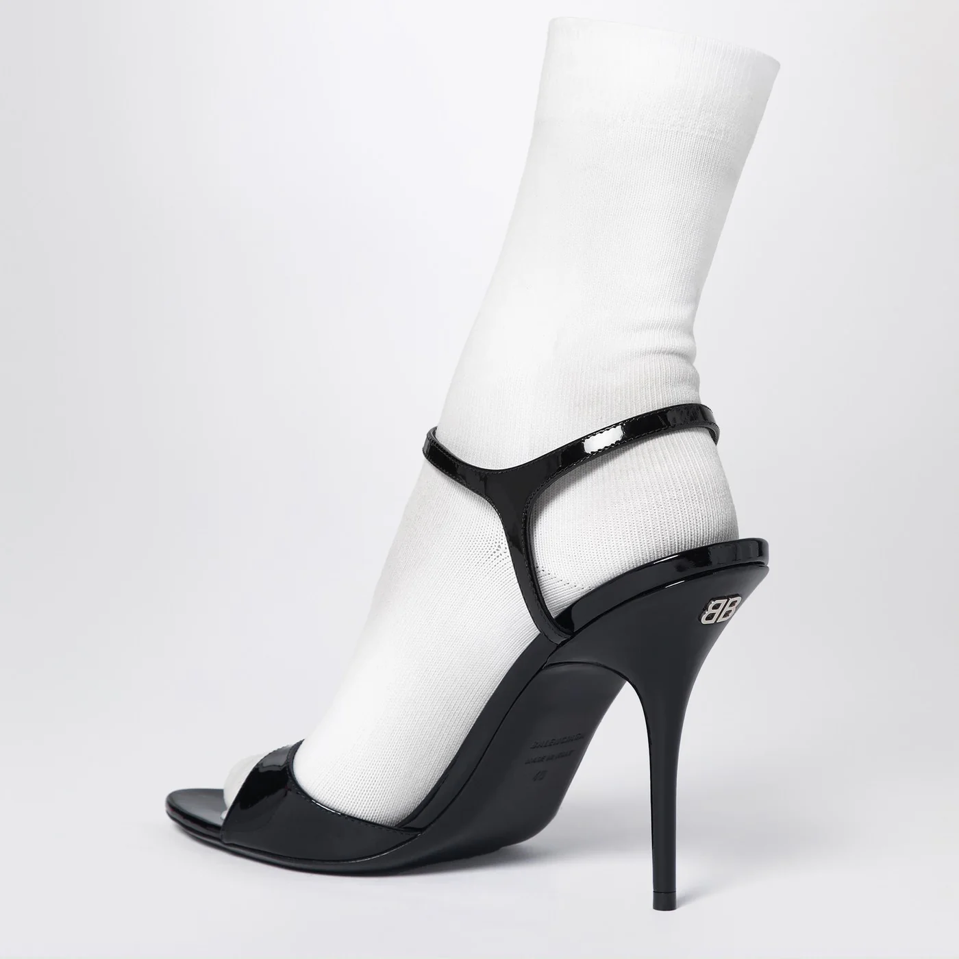 Balenciaga patent leather black calfskin sandal featuring an adjustable ankle strap closure integrated white knitted sock high thin heel with a metal BB logo on the back open toe and leather sole.