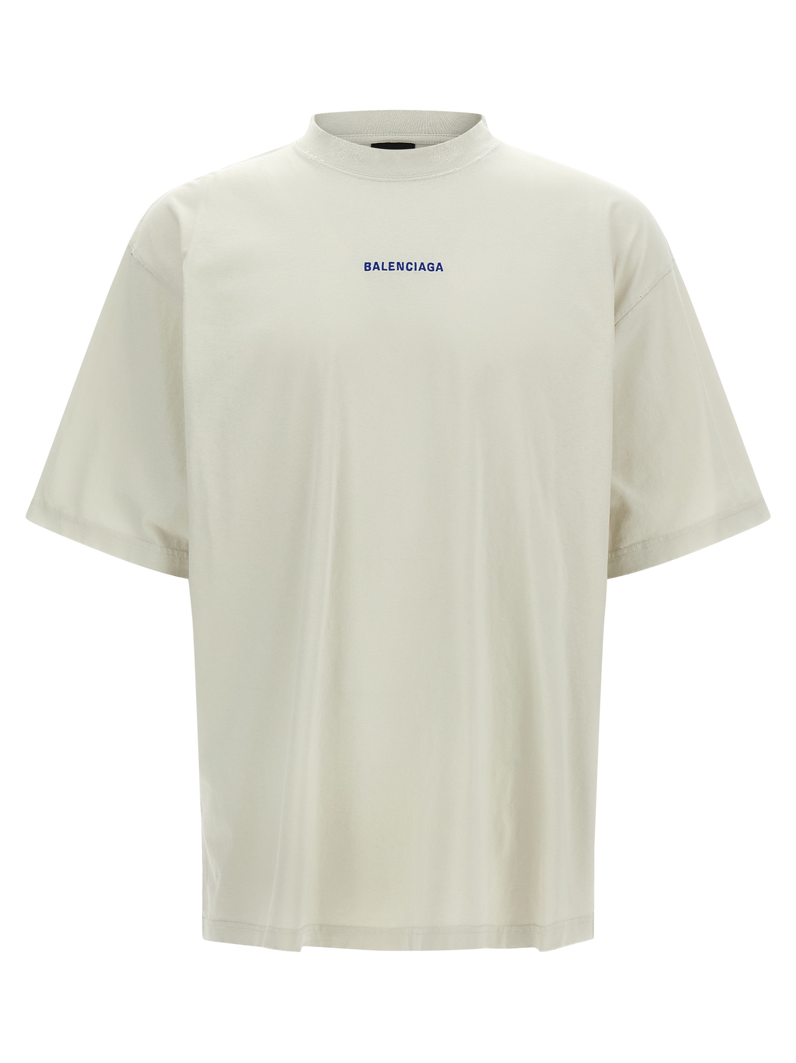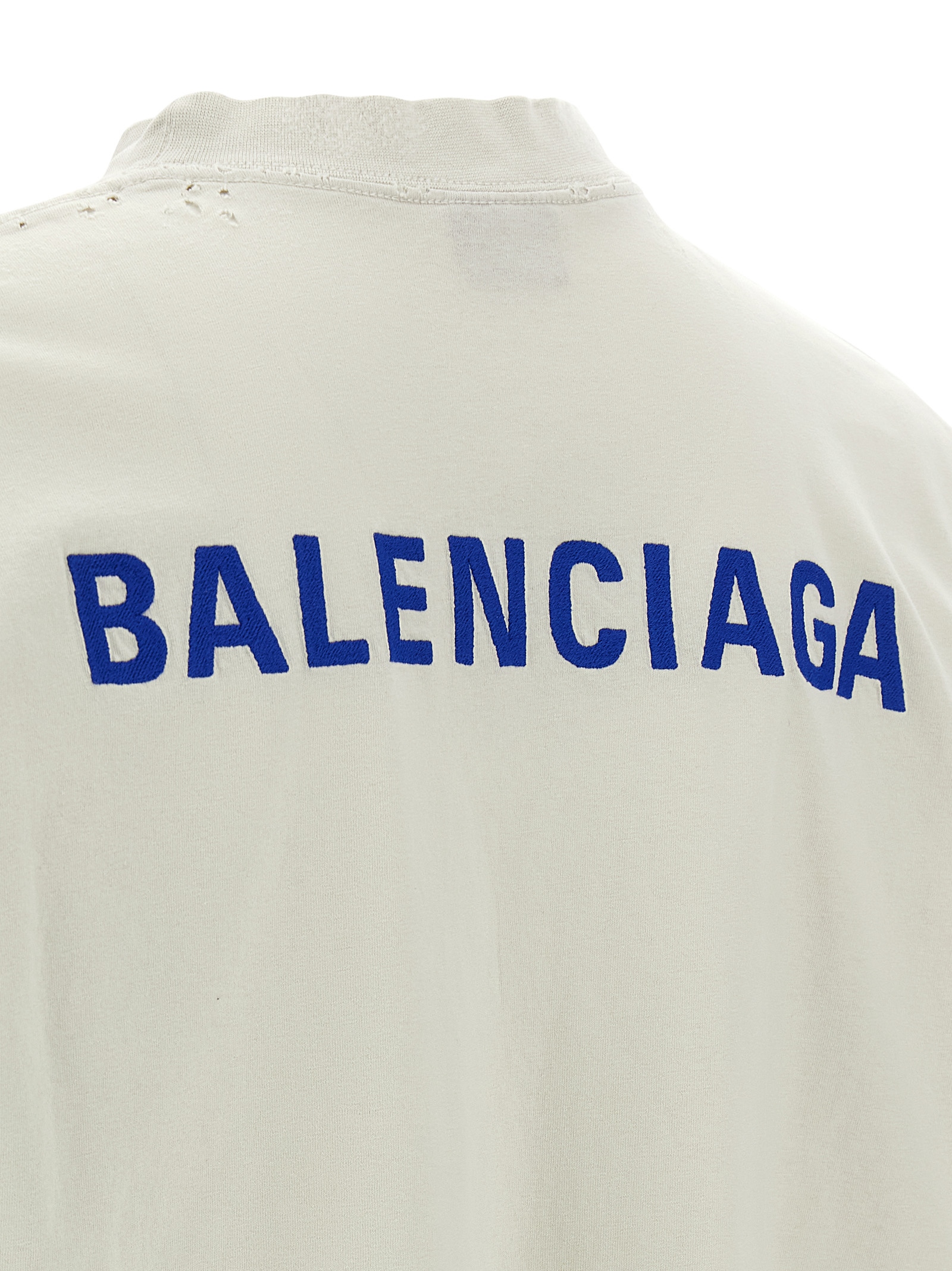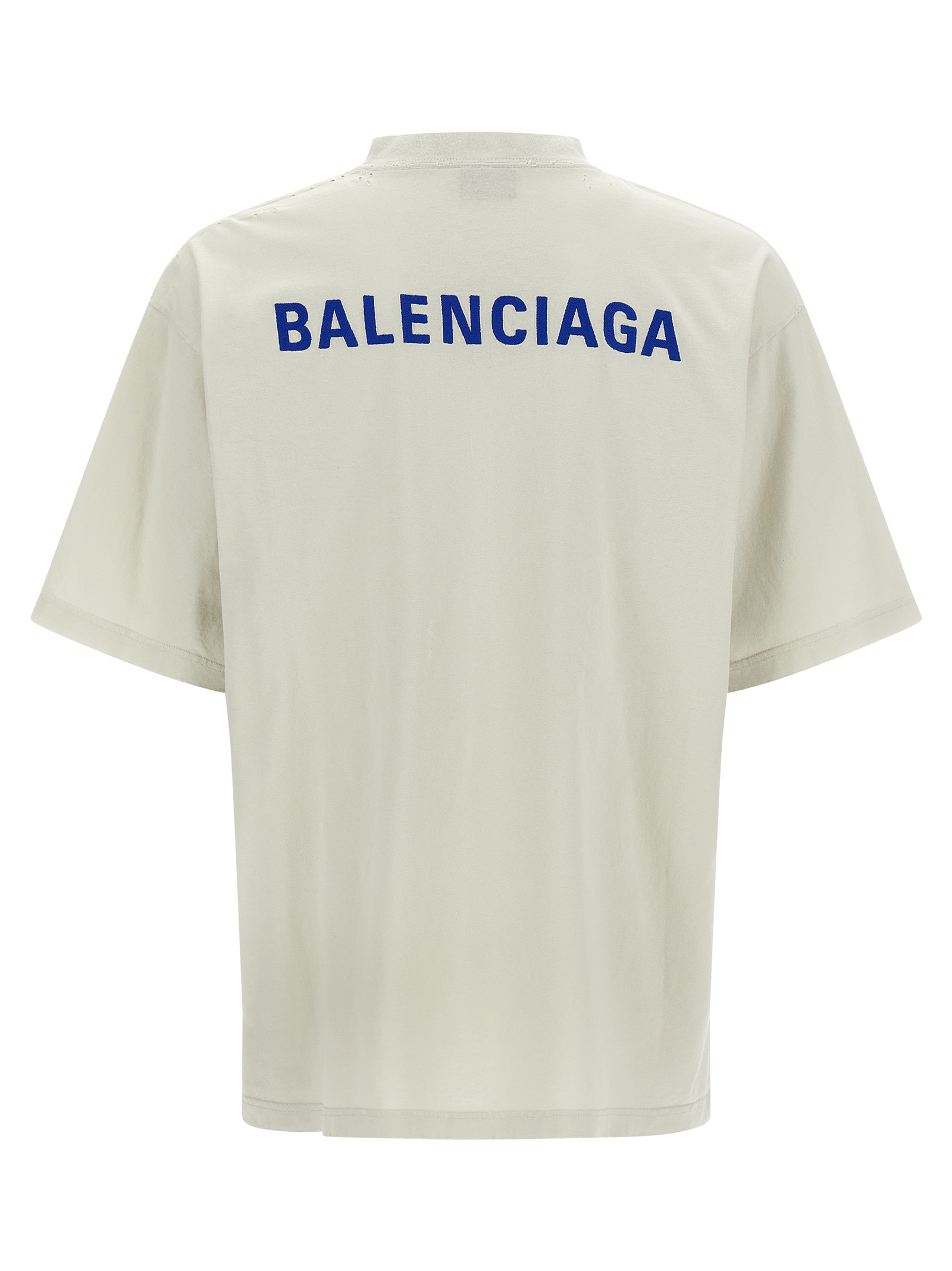 Dry used jersey t-shirt with rips, ‘Balenciaga Back’ embroidered logo on the front and back, crew neck, short sleeves and dropped shoulders.